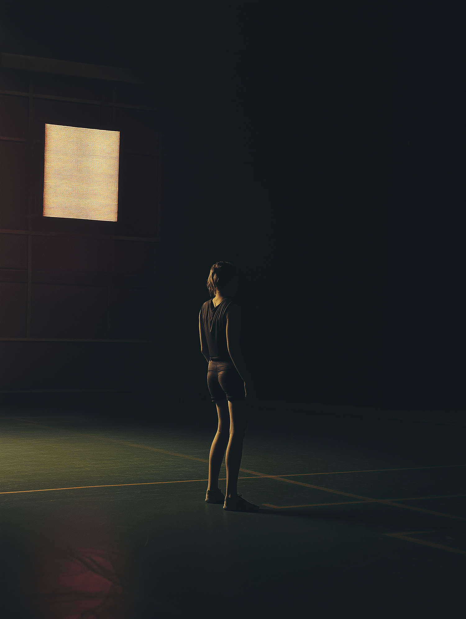 A lone figure stands in a dimly lit sports hall, illuminated by a glowing panel, creating a moody and contemplative atmosphere.