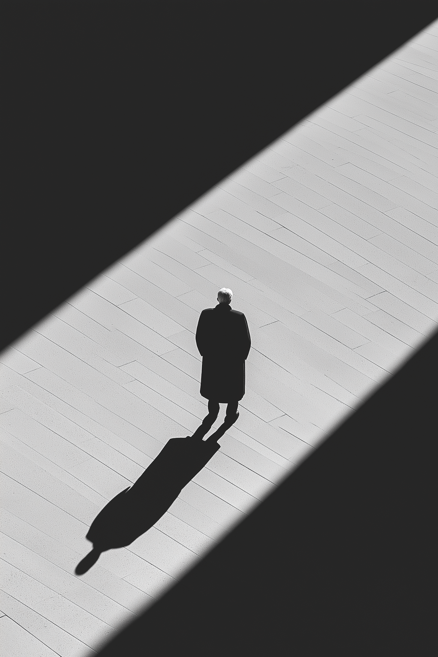 Minimalist scene of a solitary figure in a long coat, casting a shadow in a dramatic beam of light on a tiled surface.