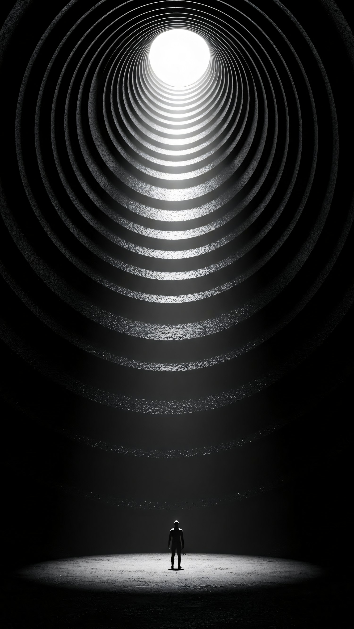 A lone figure stands in a vast, dark chamber with concentric walls, illuminated by a bright light from above, evoking mystery and awe.