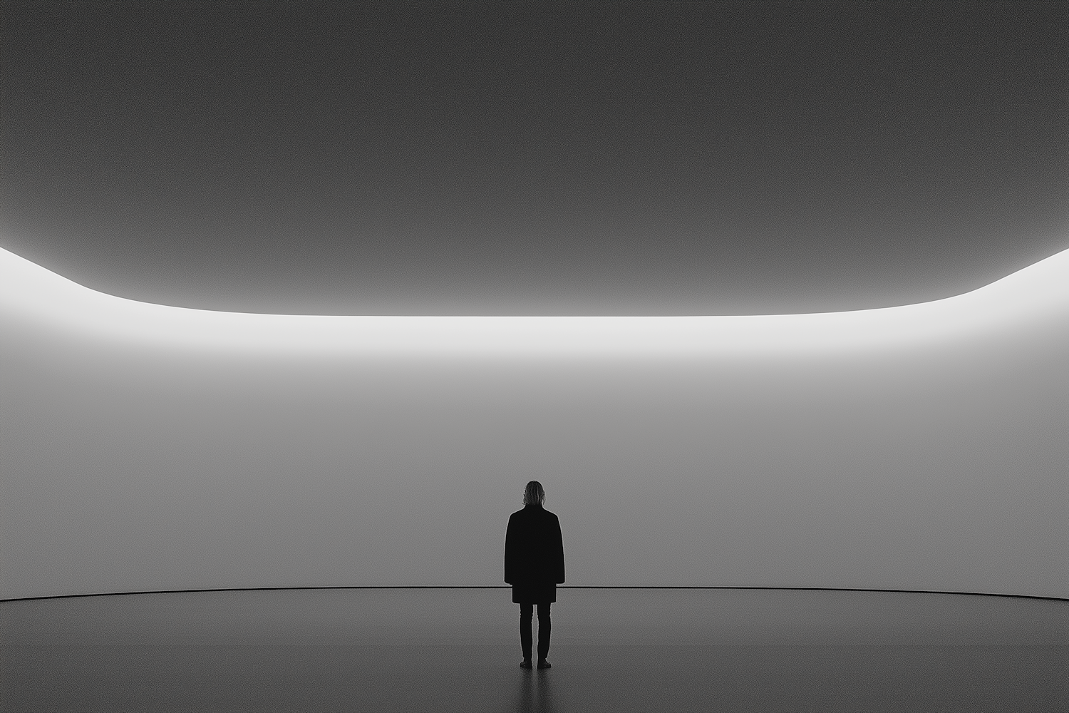 Minimalist scene of a lone figure in a vast, softly lit space with a curved wall, evoking solitude and introspection.