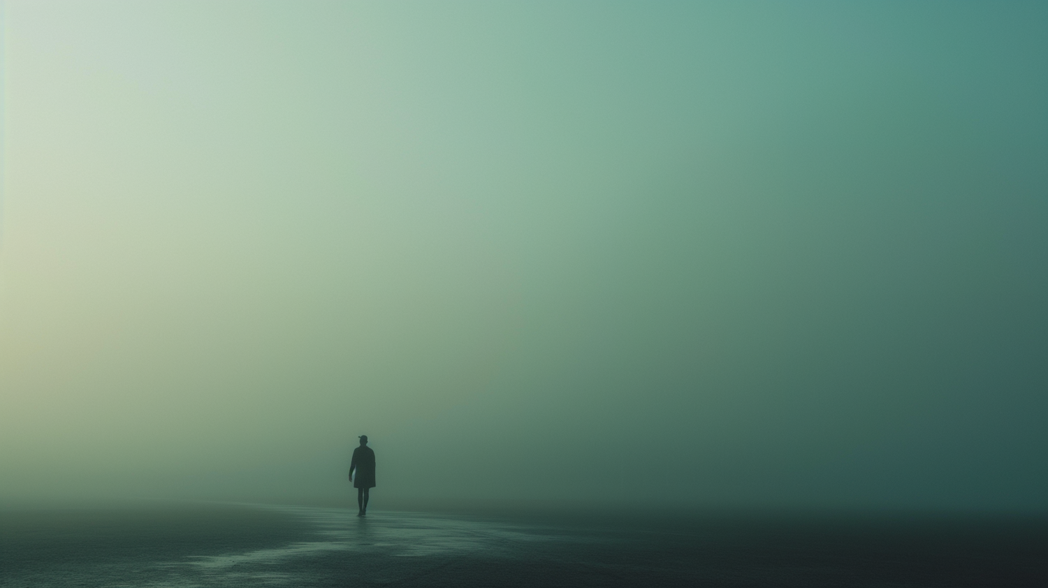 A lone figure walks through a foggy landscape, creating a mysterious and serene atmosphere with muted green and blue tones.