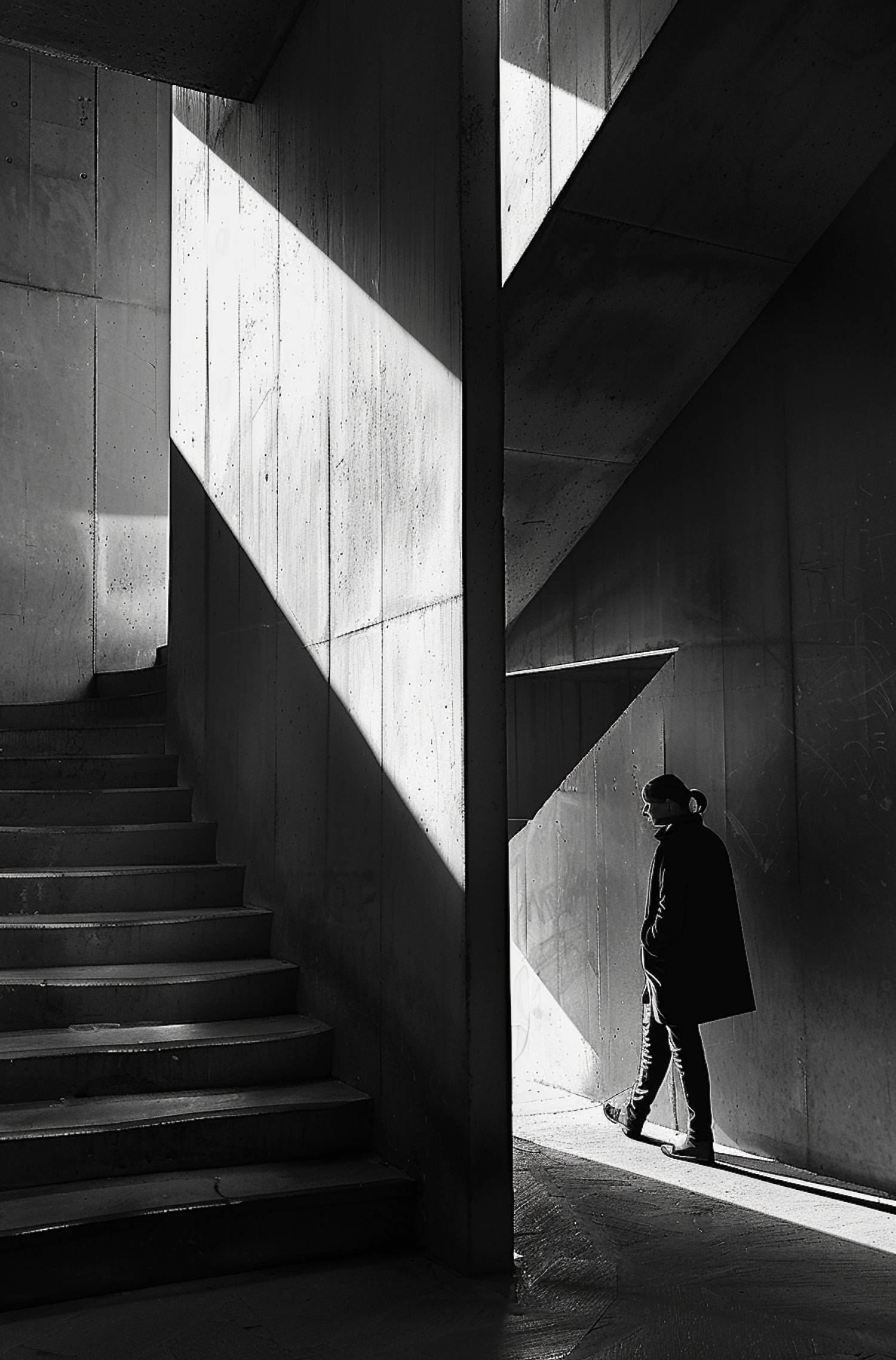 Dramatic black and white photo of a person walking in a stark, shadow-filled architectural space.