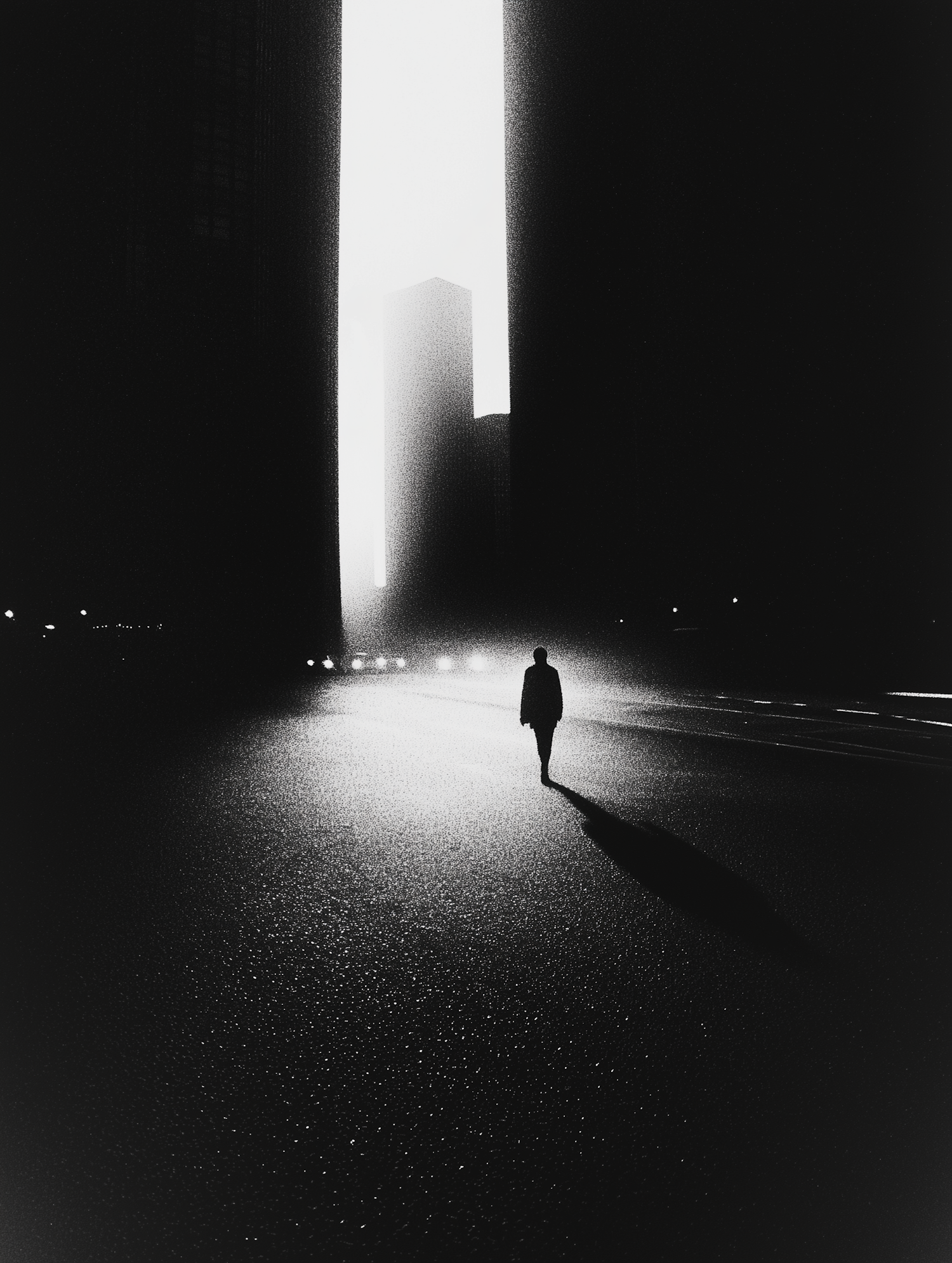 A lone figure walks down a dark street, casting a long shadow. Tall buildings frame a bright path, creating a mysterious atmosphere.