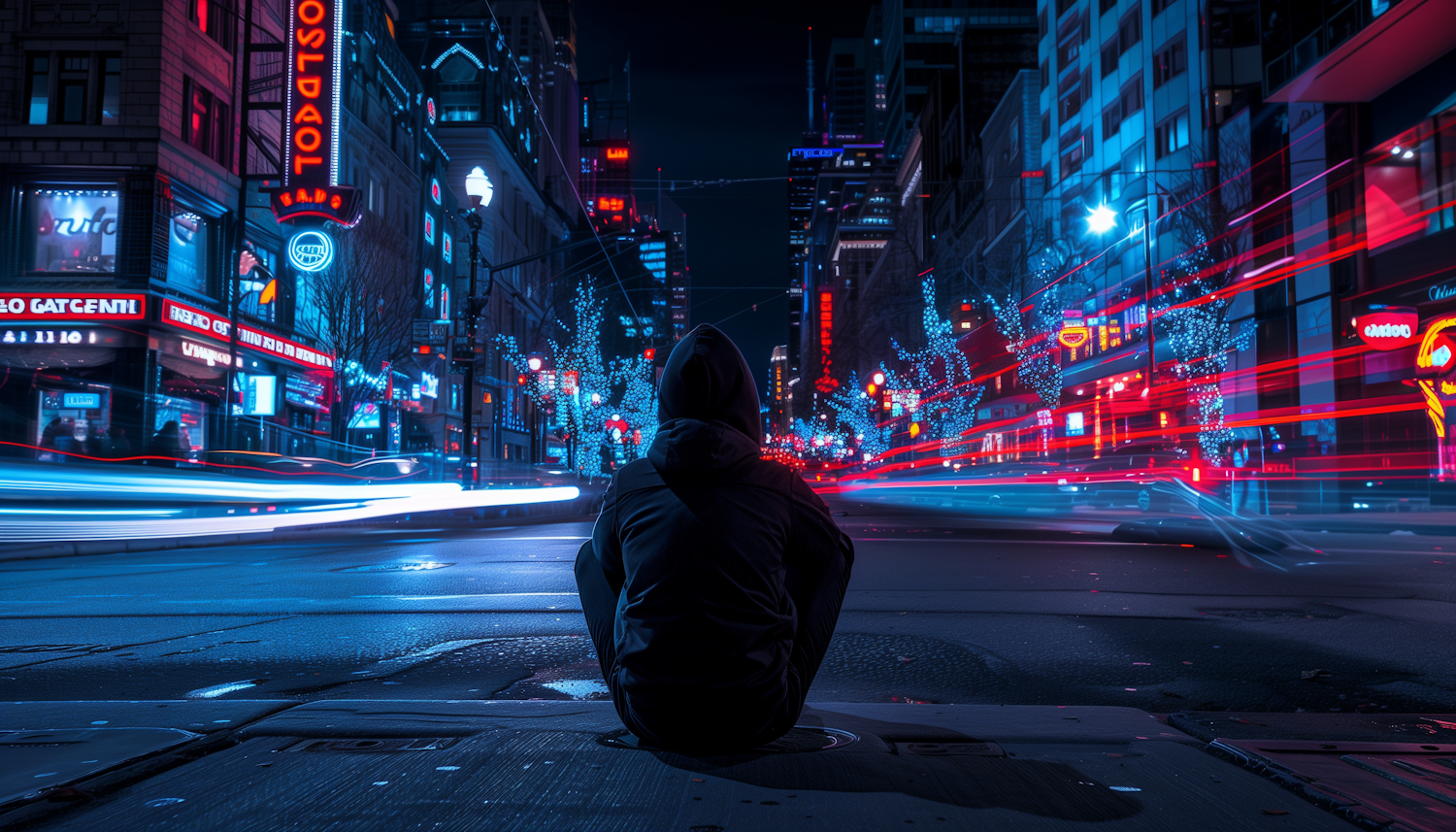 A person in a hoodie sits on a neon-lit city street at night, surrounded by vibrant light trails and urban energy.