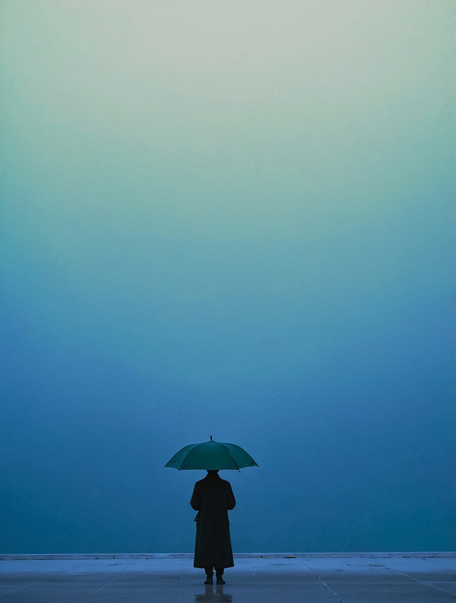 A lone figure with a green umbrella stands on a wet surface against a serene blue-to-green gradient sky.