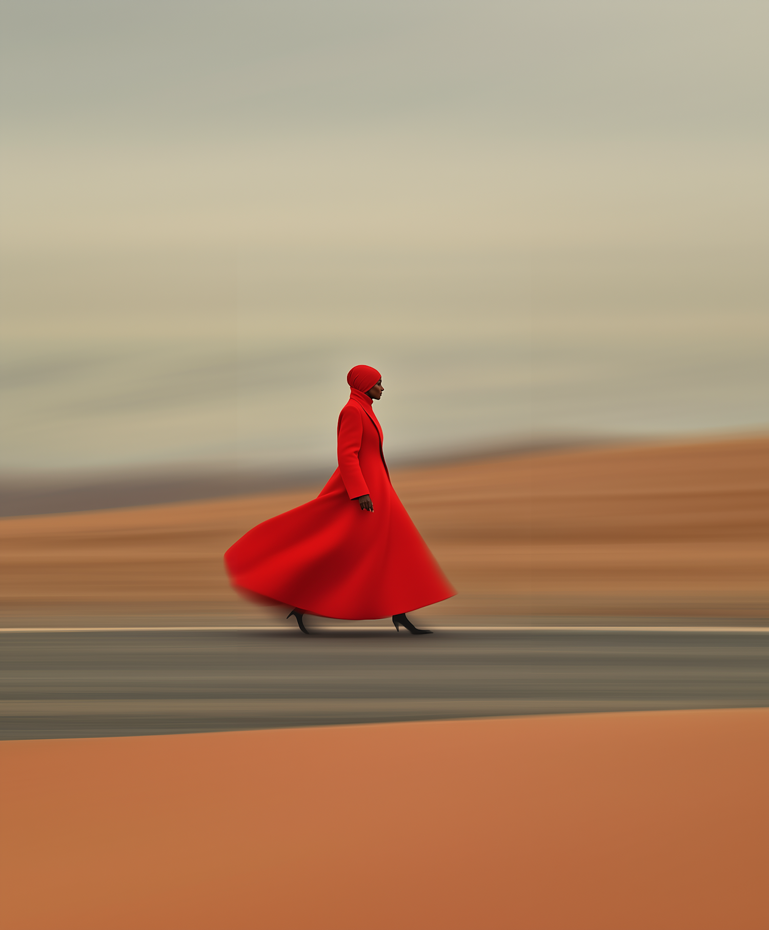 A person in a flowing red coat walks across a desert, contrasting against the muted sand dunes and cloudy sky.