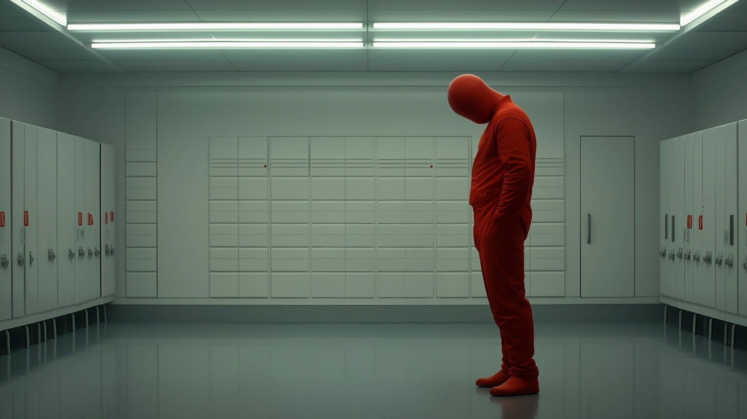 A red-suited figure stands in a sterile white locker room under bright fluorescent lights, evoking a futuristic and contemplative mood.