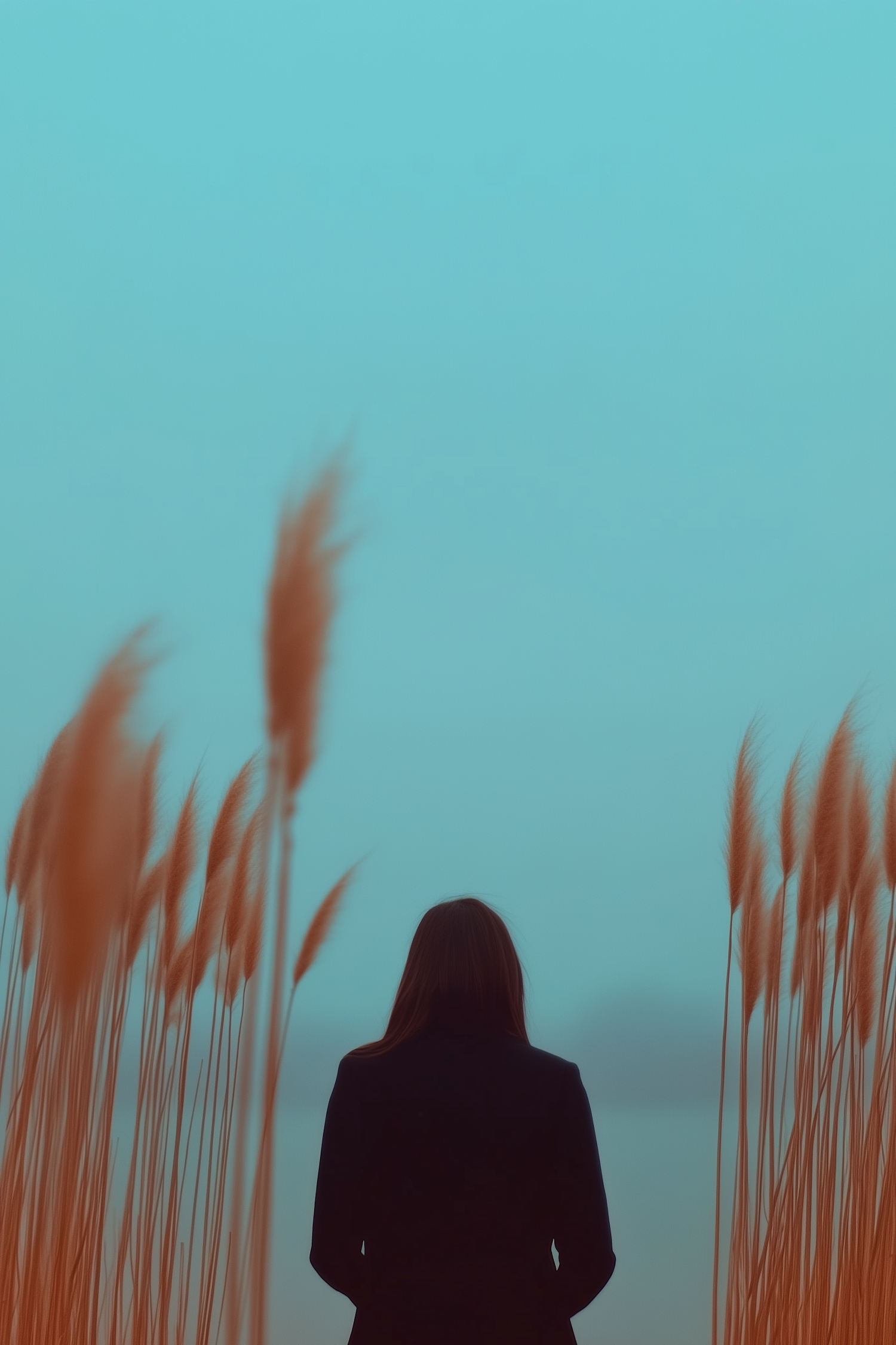 Person in dark coat stands among golden reeds under a muted blue sky, creating a serene and contemplative scene.
