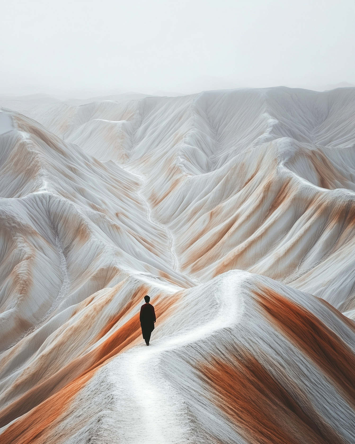 A lone figure walks along a ridge in a surreal landscape of white and orange hills, creating a striking contrast and sense of solitude.
