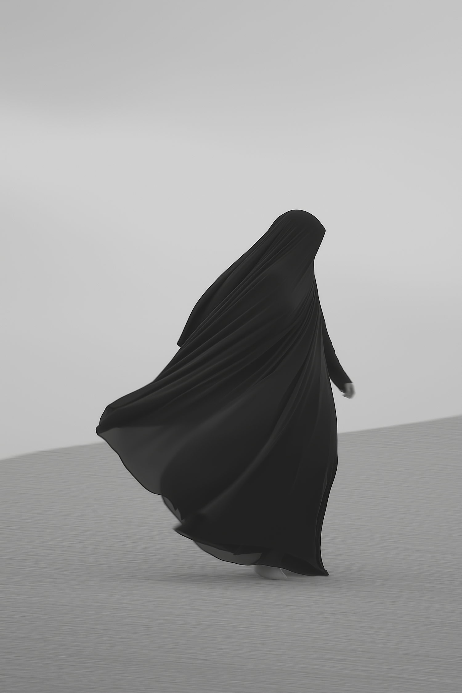 A solitary figure in a flowing black garment walks across a barren landscape, creating a striking contrast against a muted gray background.