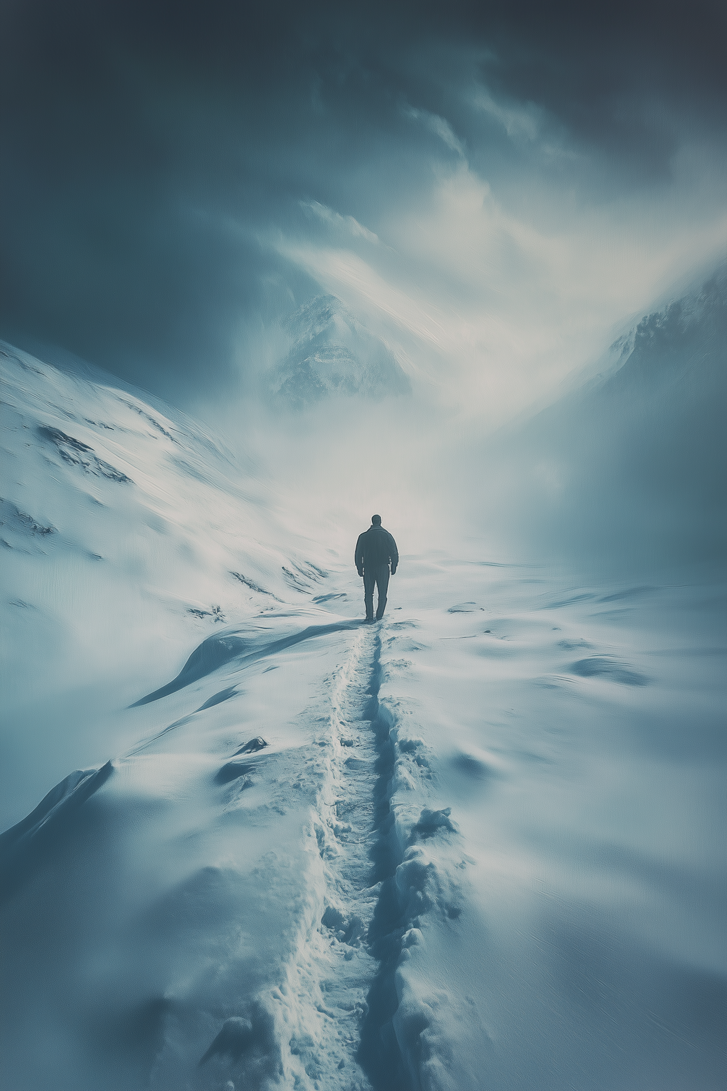 A lone figure walks through a snowy landscape, surrounded by misty mountains and an ethereal blue sky, evoking solitude and introspection.