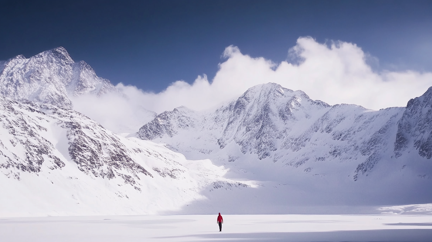 A lone figure in a red jacket stands in a vast snowy landscape with towering mountains and a clear blue sky.