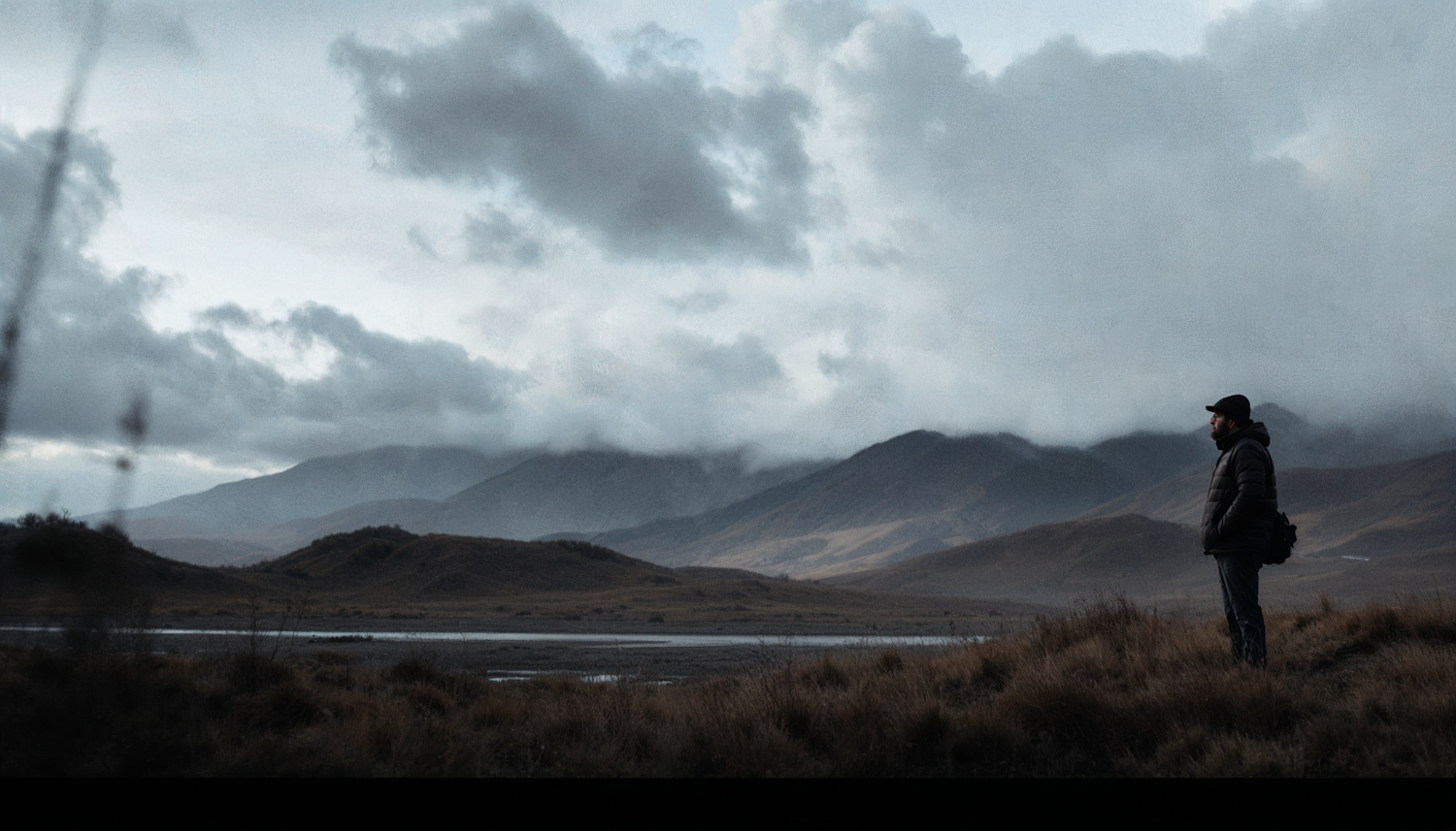 A lone traveler stands on a hill, overlooking a moody landscape of mountains and clouds, evoking solitude and introspection.