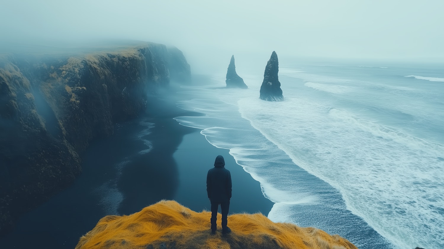 A lone figure on a golden grass cliff overlooks a misty black sand beach with jagged sea stacks and dramatic ocean waves.