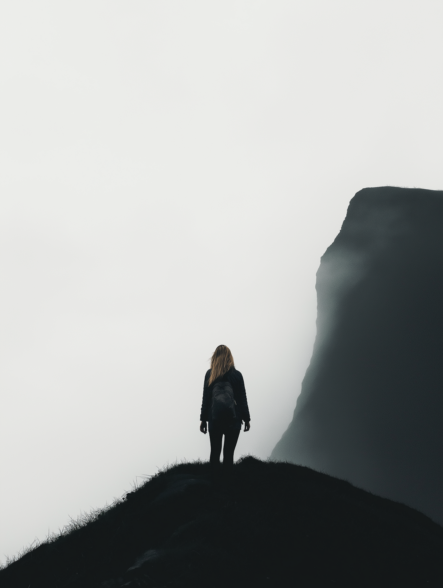 Silhouetted figure on a misty hilltop, gazing at a towering cliff. A scene of solitude and contemplation in nature.