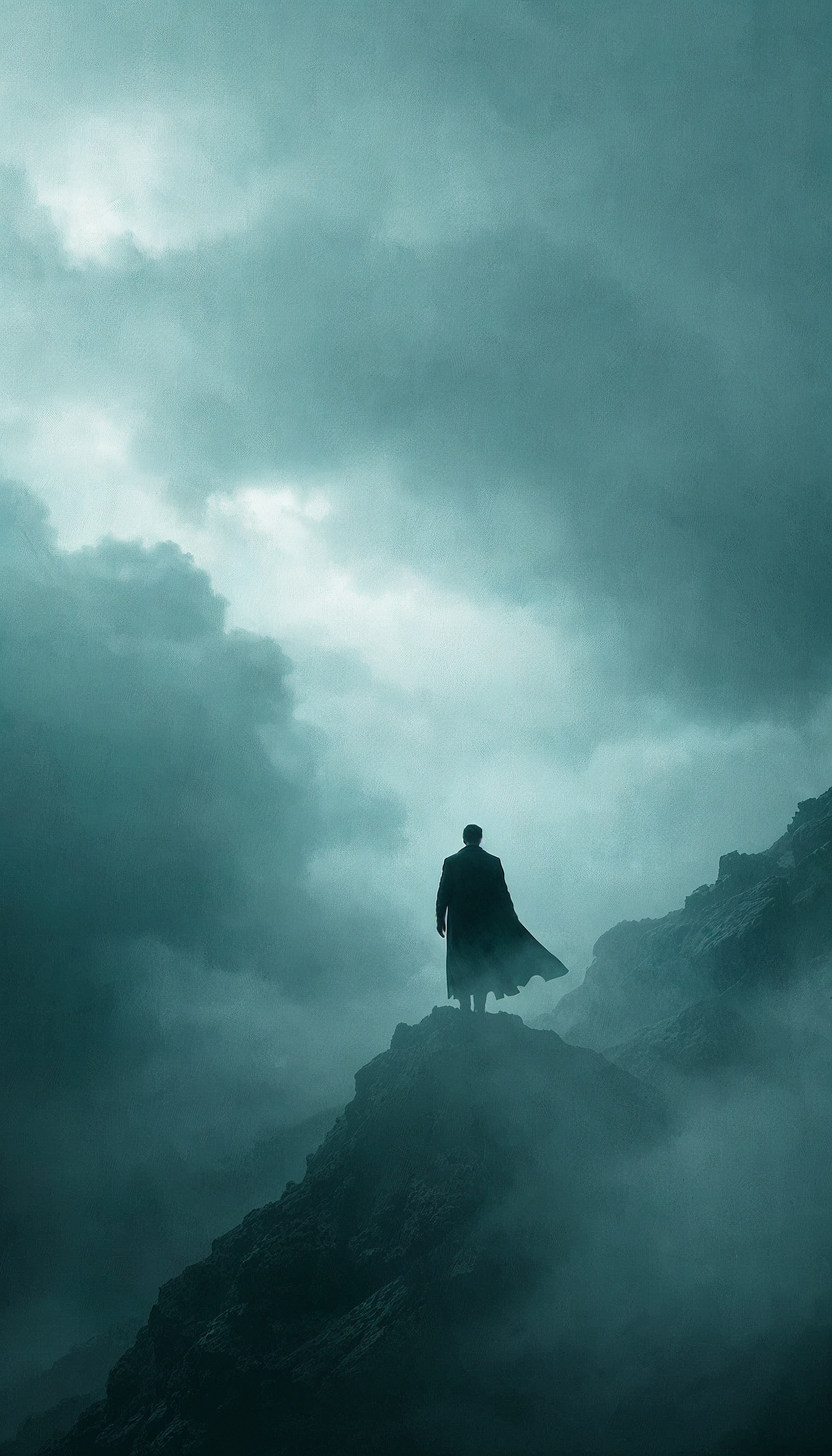 A lone figure in a dark coat stands on a misty mountain peak under dramatic clouds, creating a mysterious and atmospheric scene.