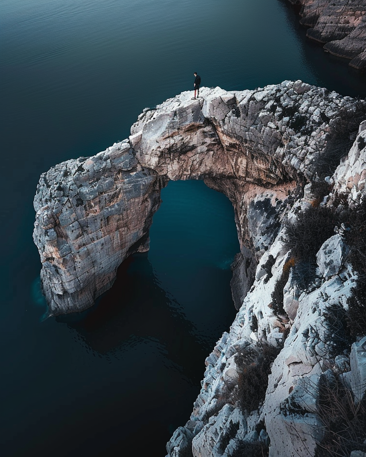 A person stands on a natural stone arch over deep blue water, surrounded by rugged cliffs and serene landscape.