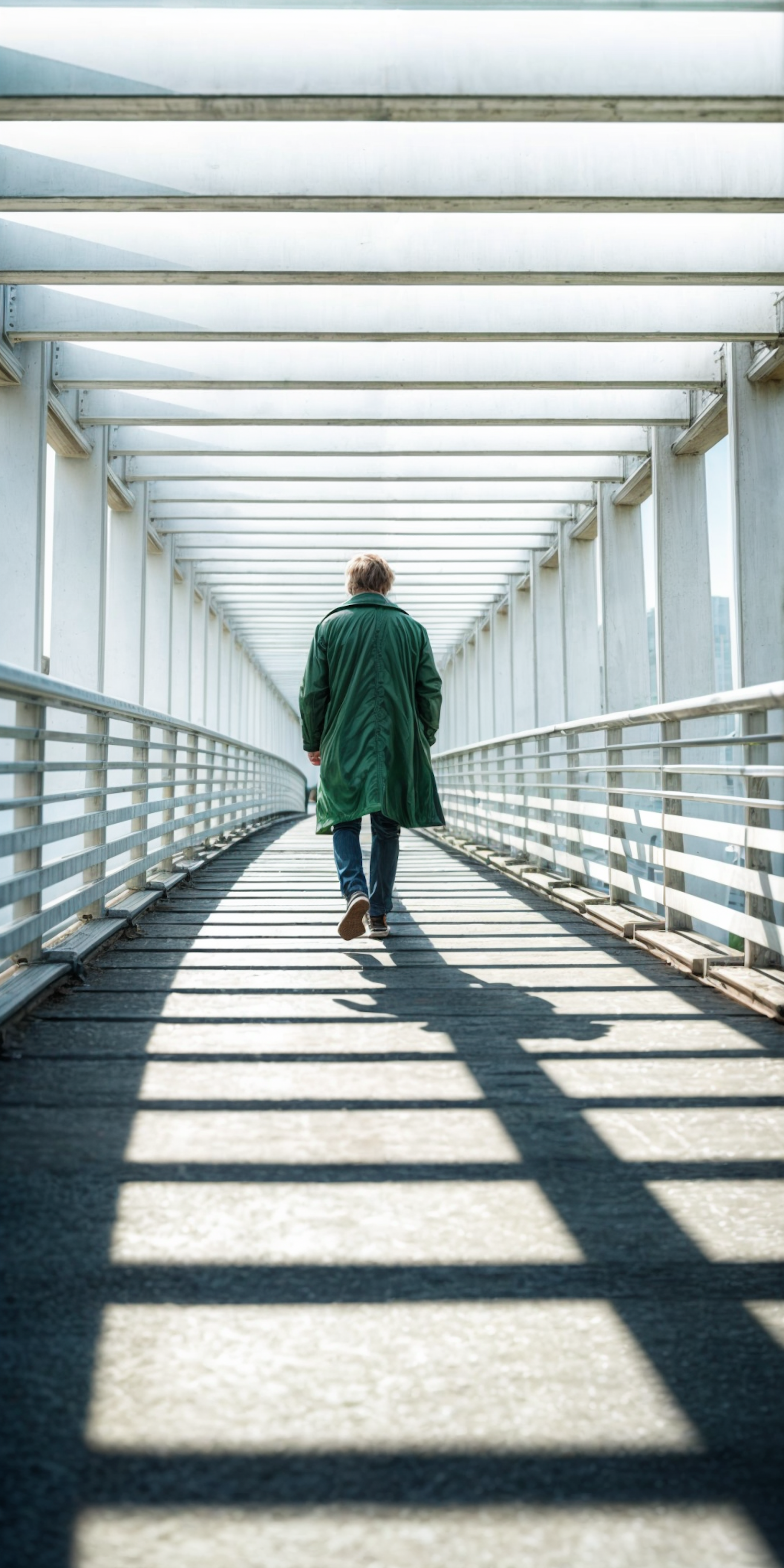 Person in green coat walking on a long, covered pedestrian bridge with striking light and shadow patterns.