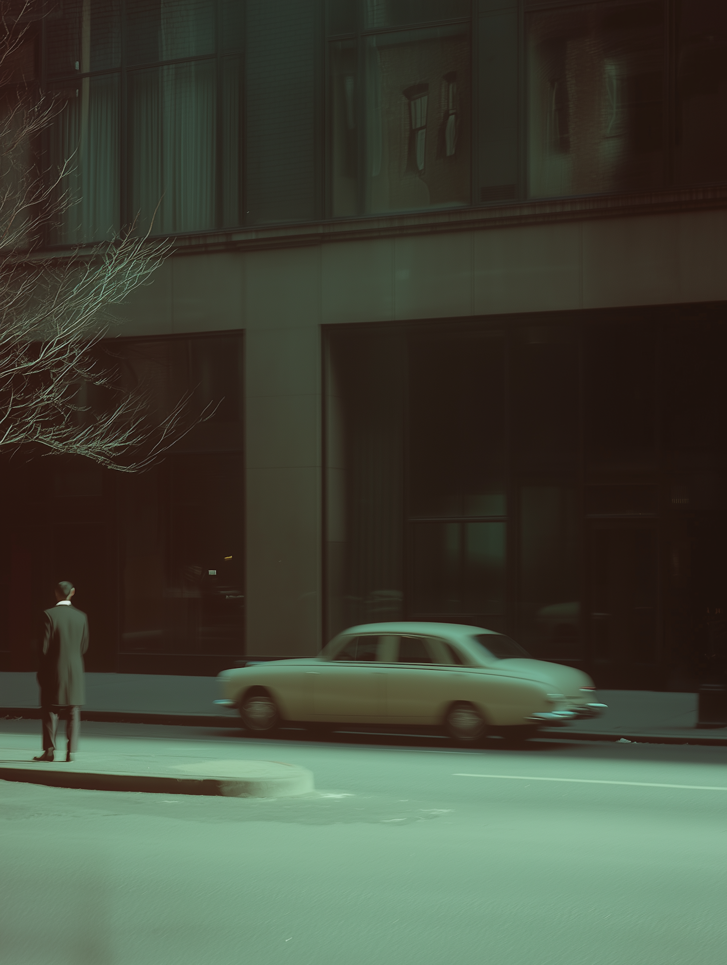 A lone figure in a dark coat stands on a city street with a vintage car nearby, all under a greenish hue.
