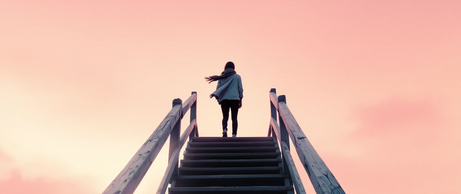 Silhouetted woman on wooden stairs against a pink sky, evoking solitude and introspection with a dreamlike atmosphere.