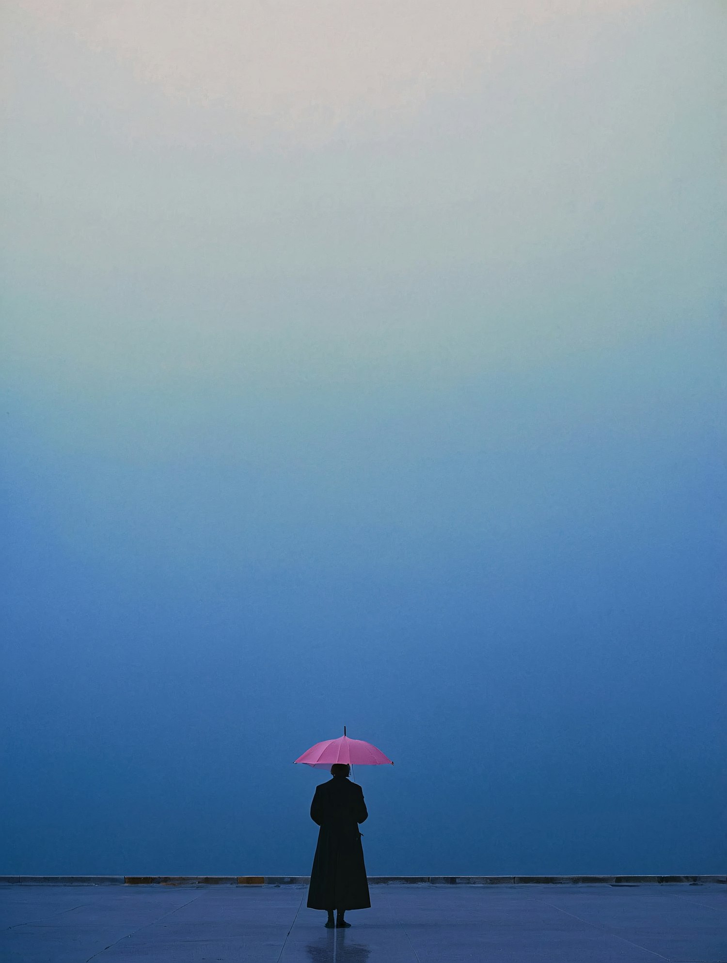 A lone figure with a pink umbrella stands on a reflective surface under a serene blue gradient sky, creating a minimalist and tranquil scene.