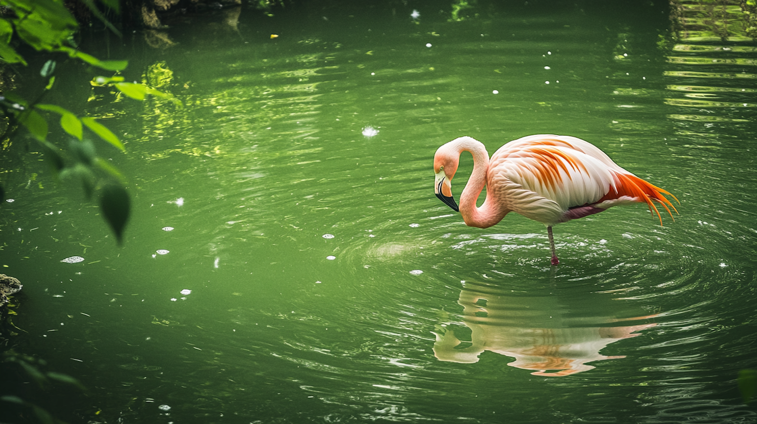 A pink flamingo stands in a green pond, its reflection visible. Vibrant feathers and serene water create a tranquil scene.