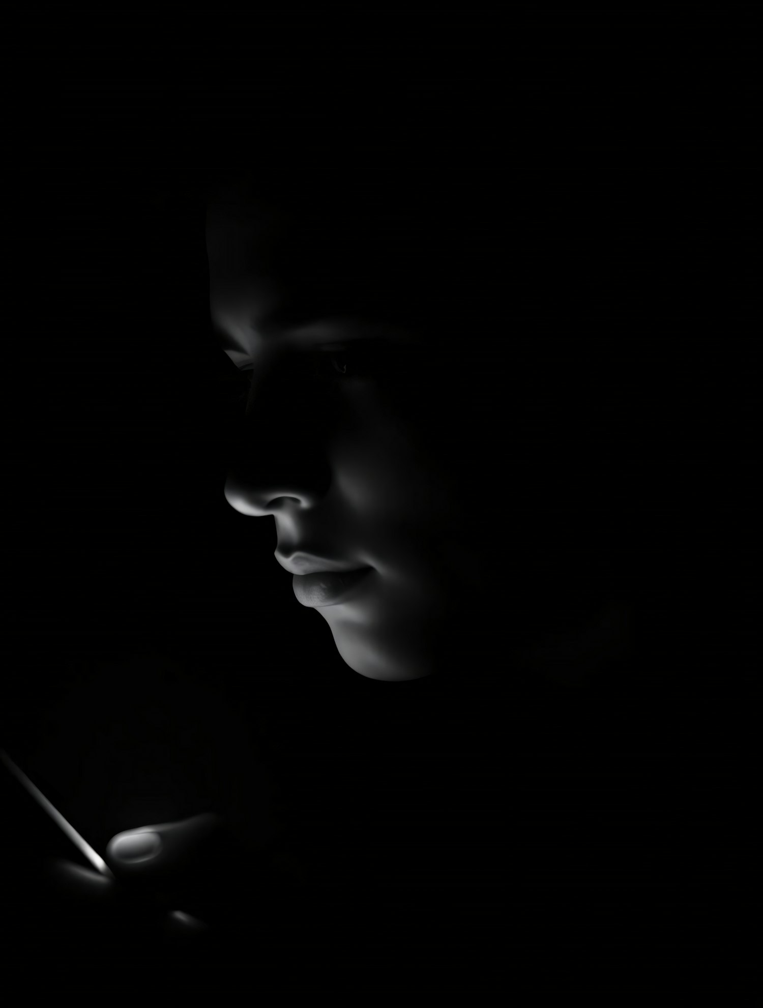 A person in the dark illuminated by a smartphone screen, creating a dramatic contrast of light and shadow.