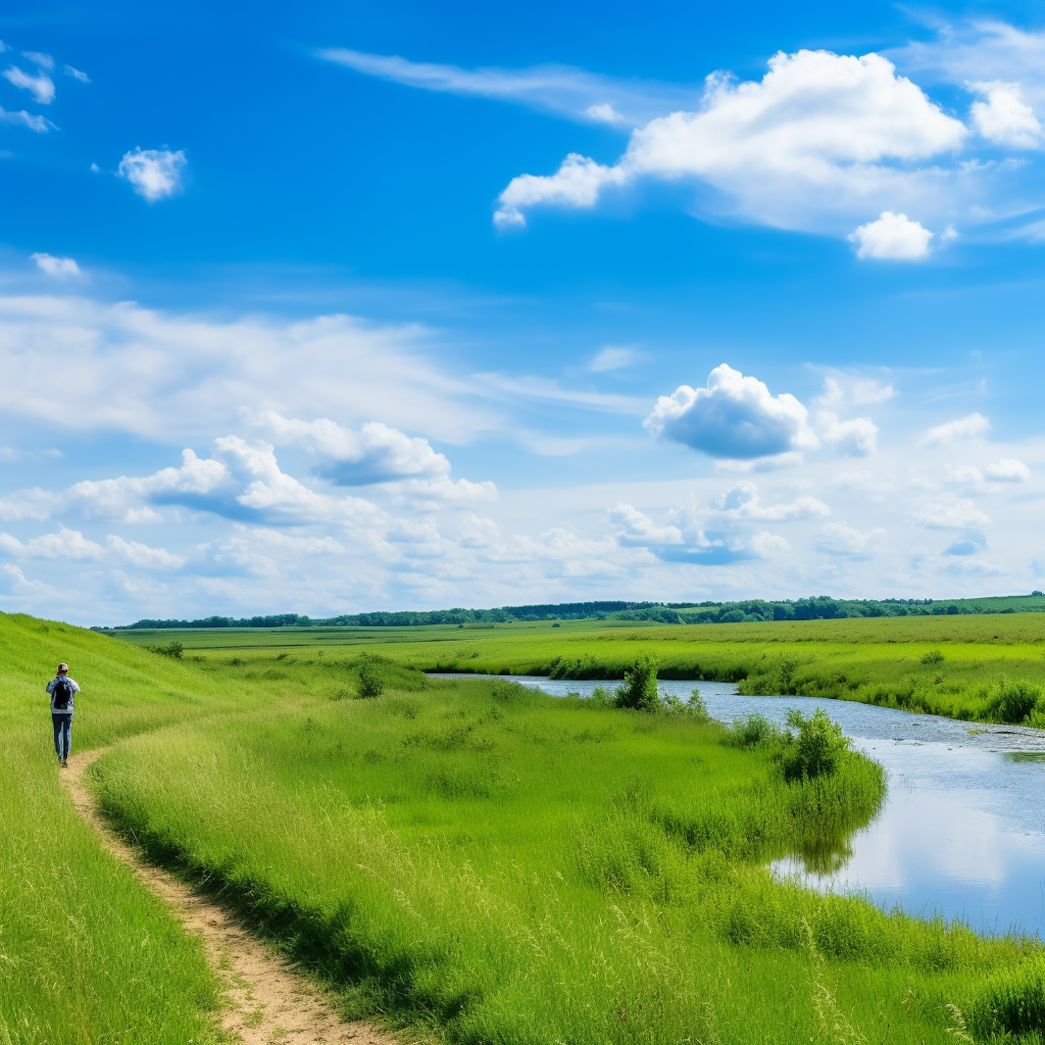 A lone hiker walks along a winding path through lush green fields under a bright blue sky with fluffy clouds.