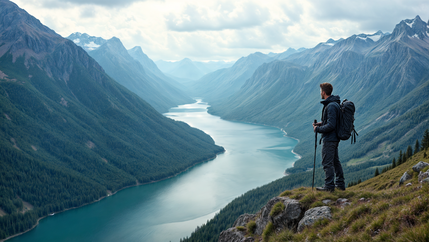 Hiker overlooking a stunning mountain valley with a winding river and snow-capped peaks under a cloudy sky.