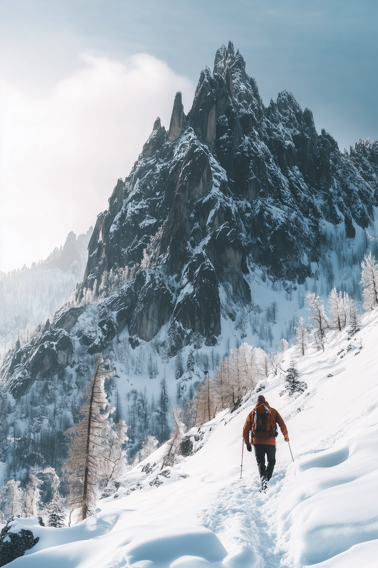 A hiker in an orange jacket climbs a snowy mountain with jagged peaks, under a clear blue sky. Winter adventure in stunning nature.