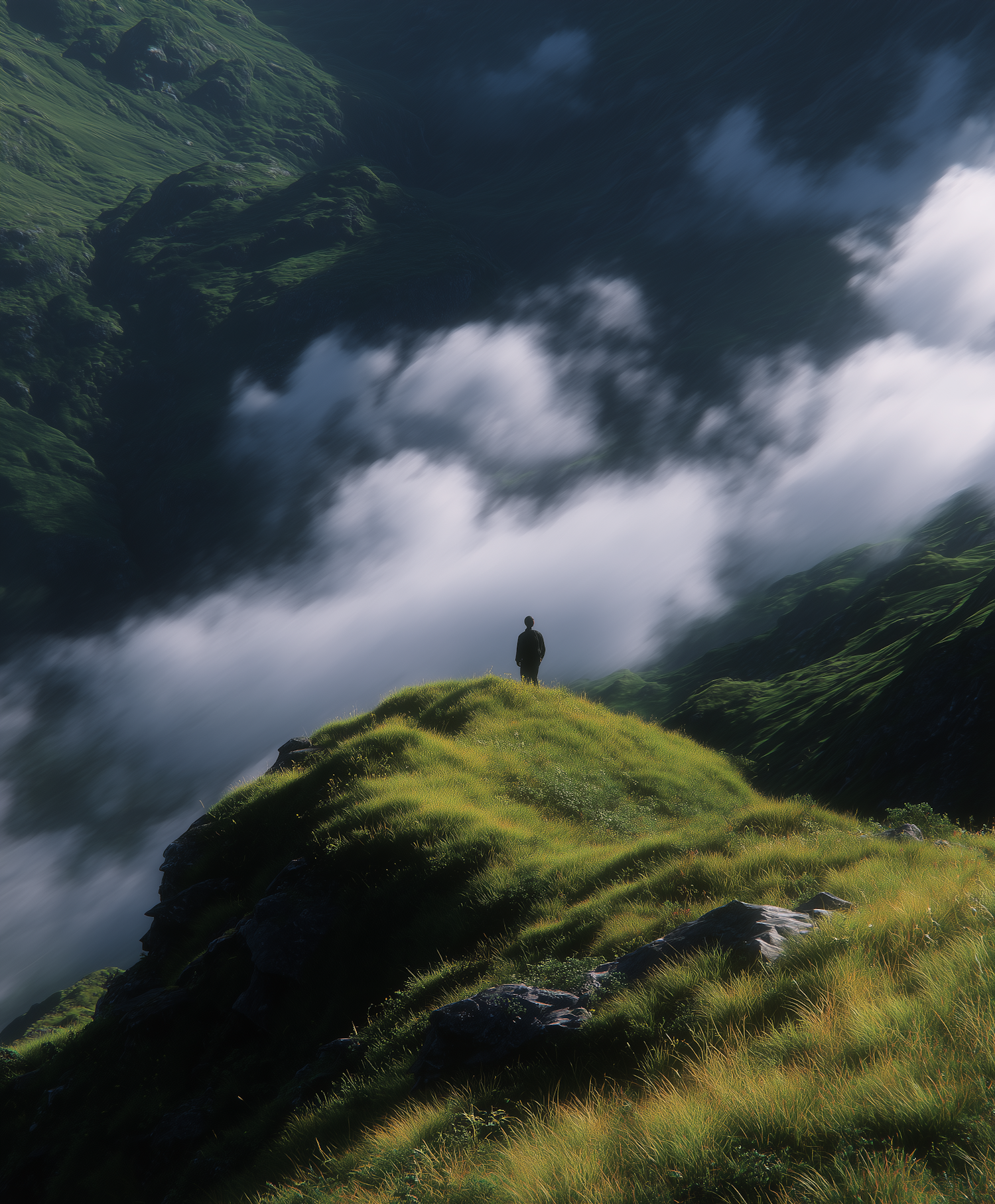 A person stands on a grassy hilltop above a valley filled with clouds, surrounded by lush green mountains under soft sunlight.