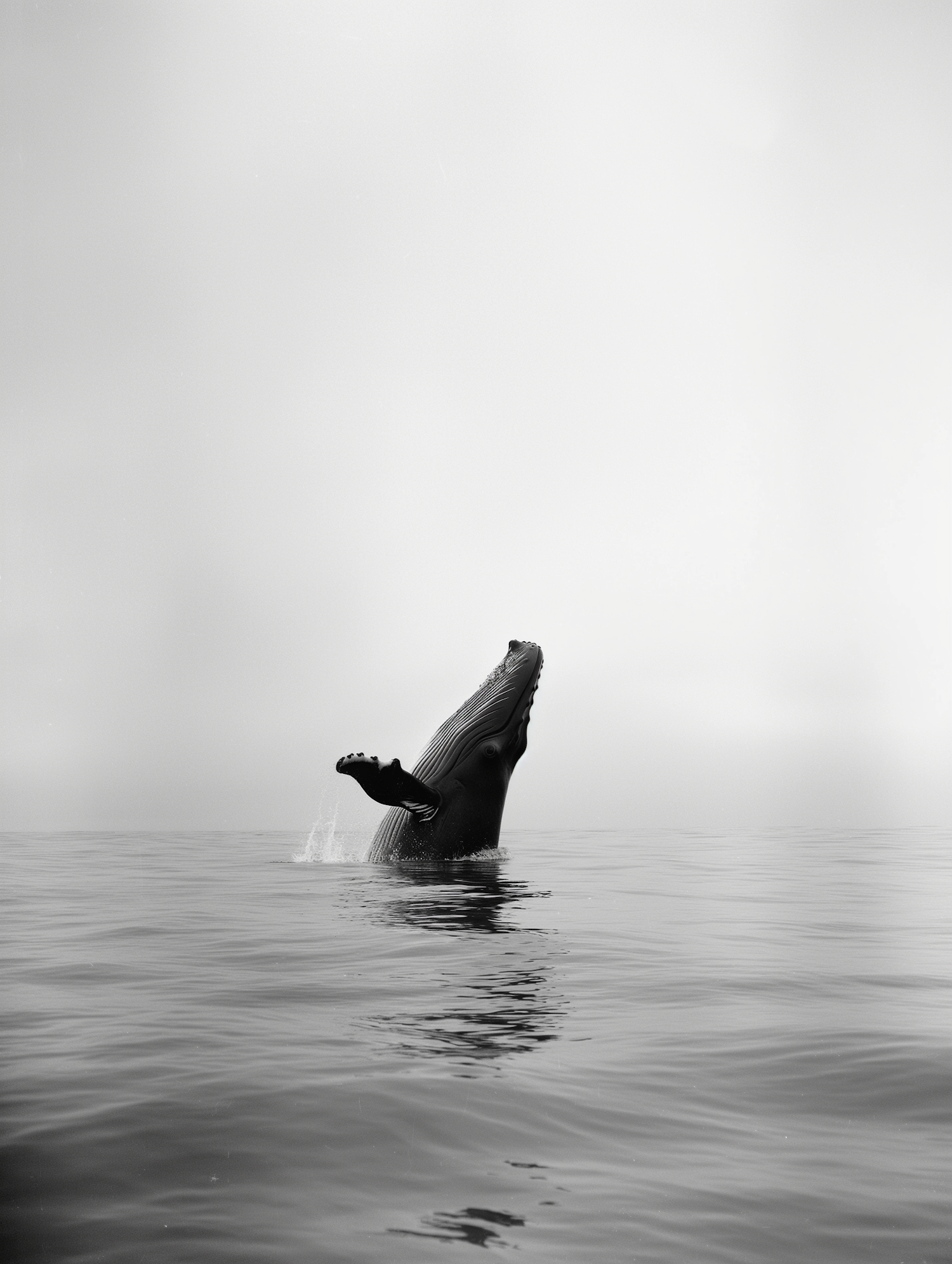 A humpback whale majestically breaches the ocean surface, captured in stunning monochrome, highlighting its grace and power.