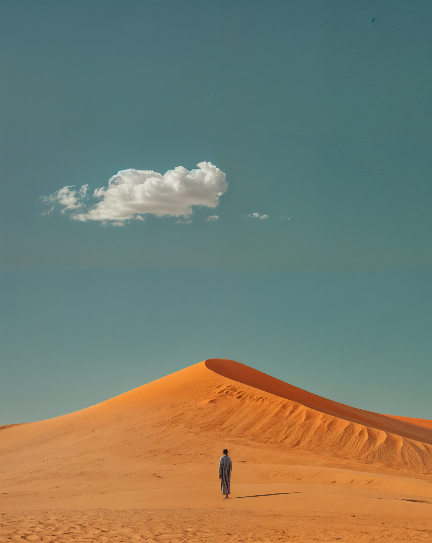 A lone figure in a robe stands before a golden sand dune under a clear blue sky with a single white cloud, evoking solitude and tranquility.