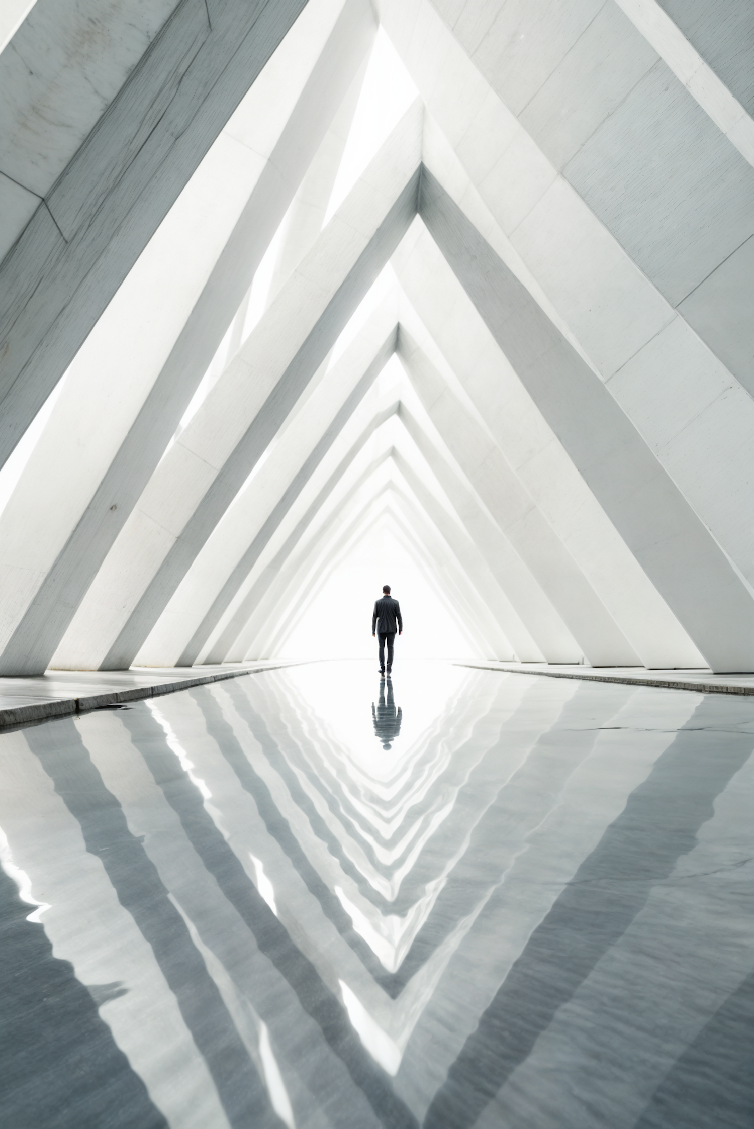 A lone figure in a suit stands in a futuristic tunnel of white triangular arches with reflective floors, creating a sense of depth.