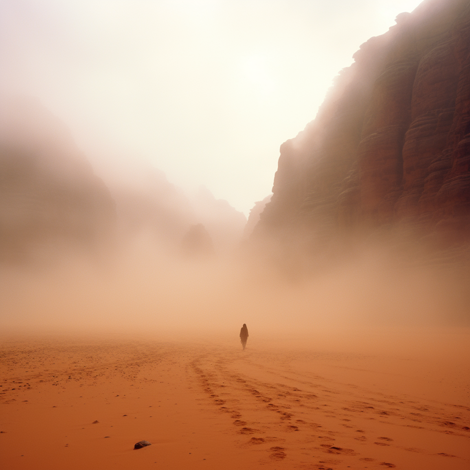 A lone figure walks through a misty desert with towering rock formations, creating an ethereal and mysterious atmosphere.