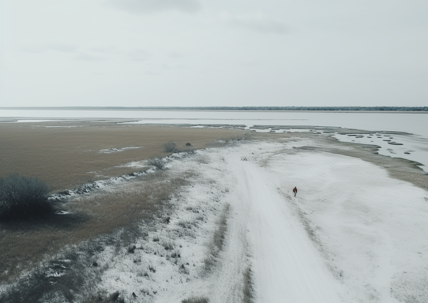 A lone figure in a red jacket walks along a snowy path in a vast, serene landscape with dry grass and a distant body of water.