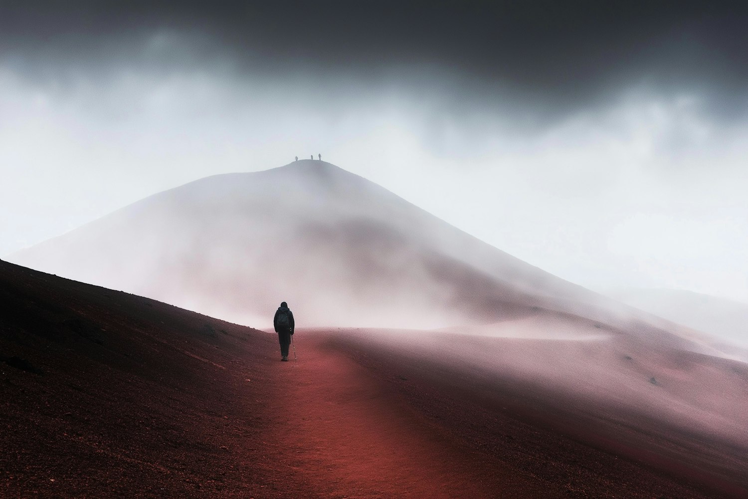 A lone hiker walks a misty path towards a fog-covered hill, creating a mysterious and atmospheric scene with earthy tones.