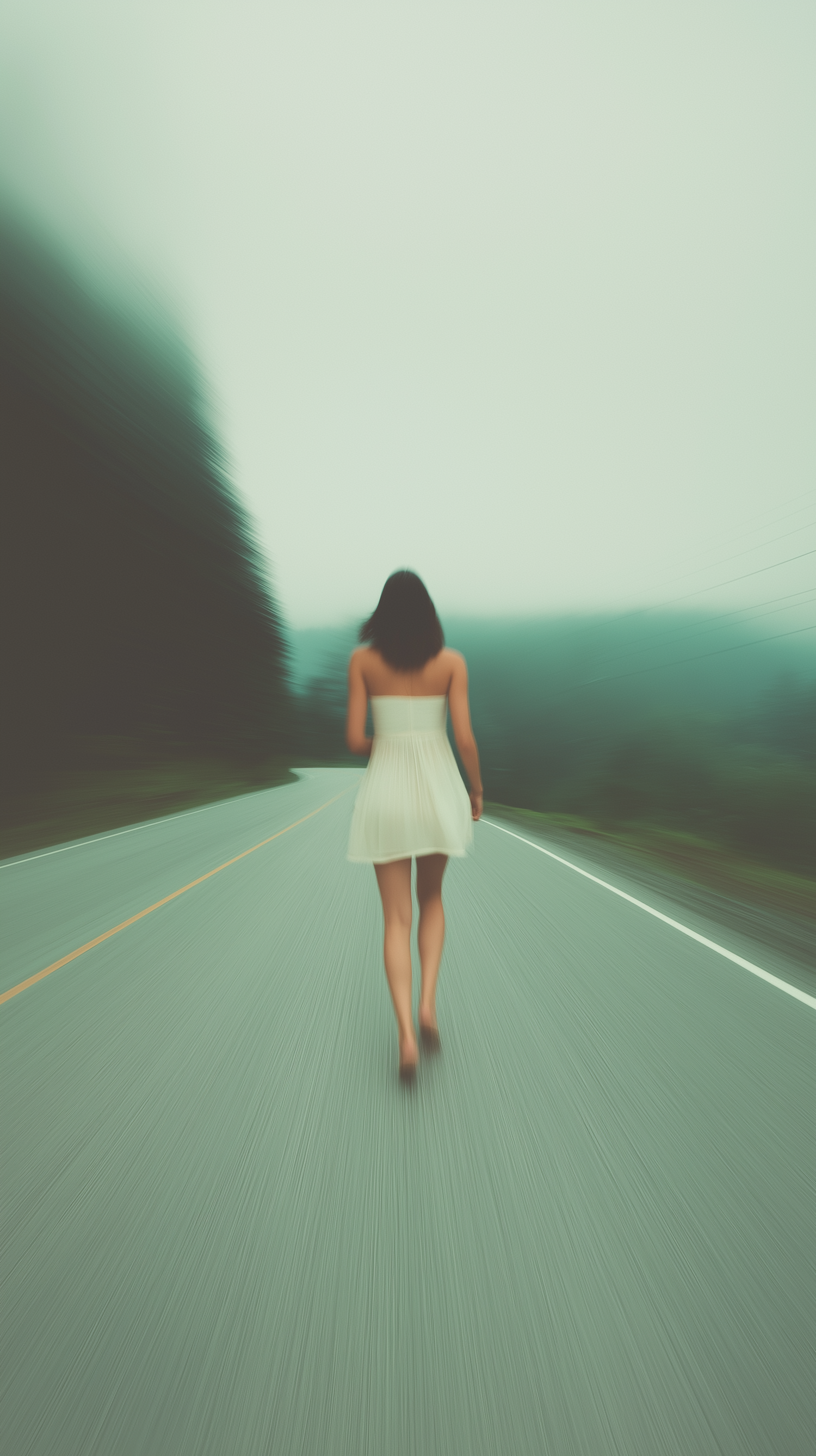 Woman in white dress walking barefoot on a foggy road, creating a dreamy, mysterious atmosphere with blurred surroundings.