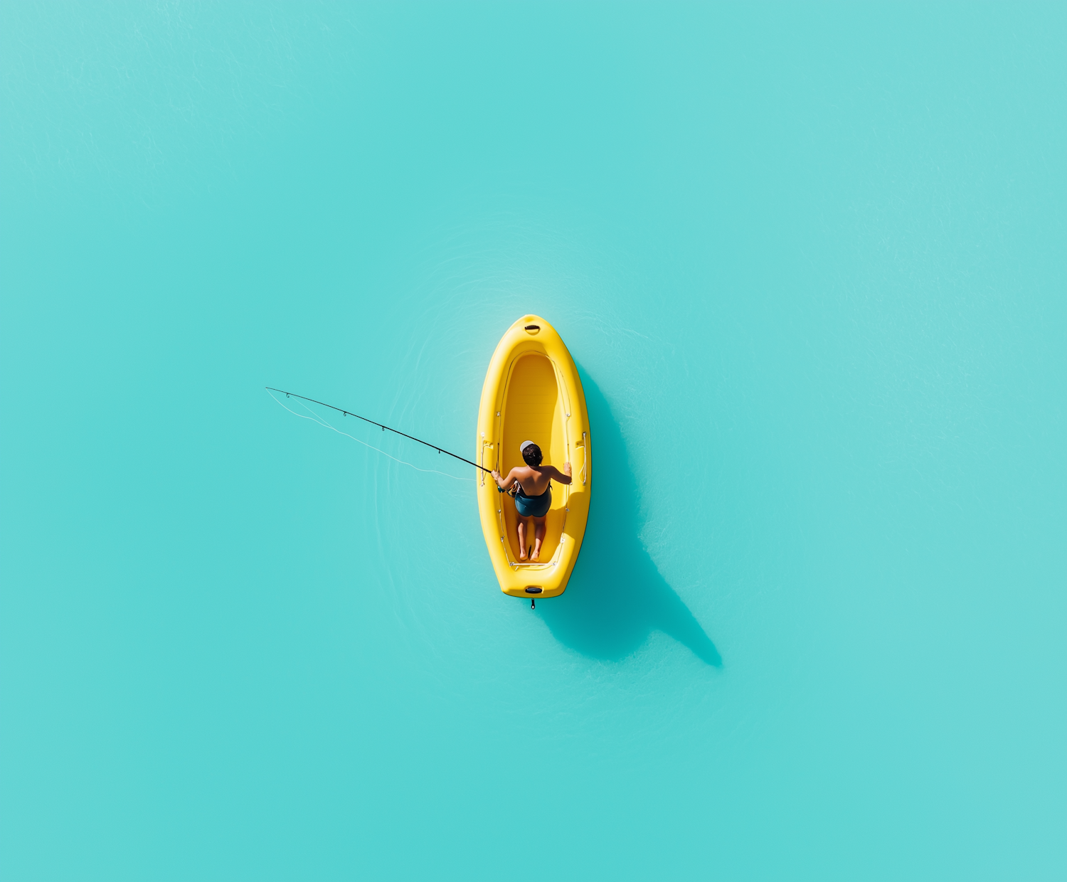A person fishing from a yellow kayak on calm turquoise waters, creating a serene and minimalist scene.