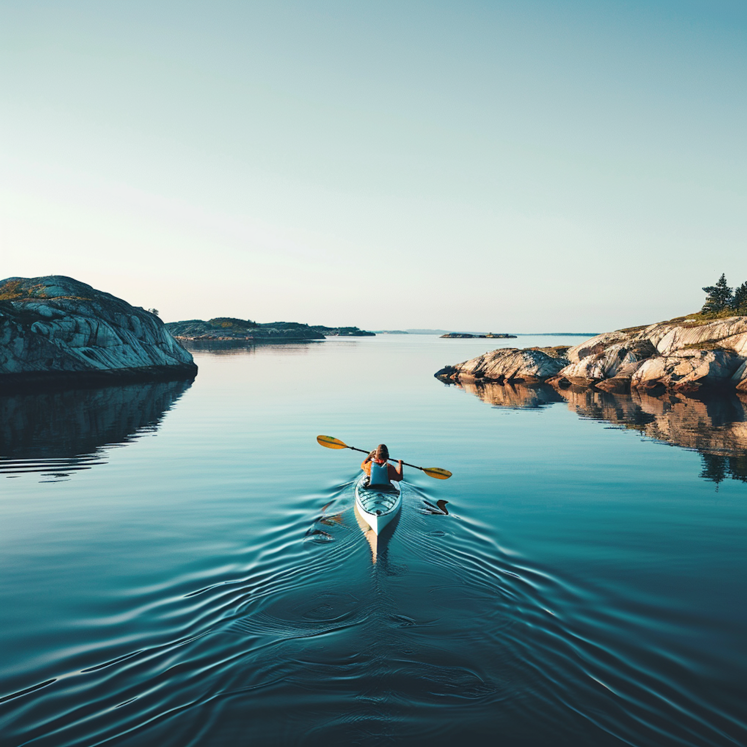 A kayaker paddles through calm blue waters surrounded by rocky islands under a clear sky, creating a serene and tranquil scene.