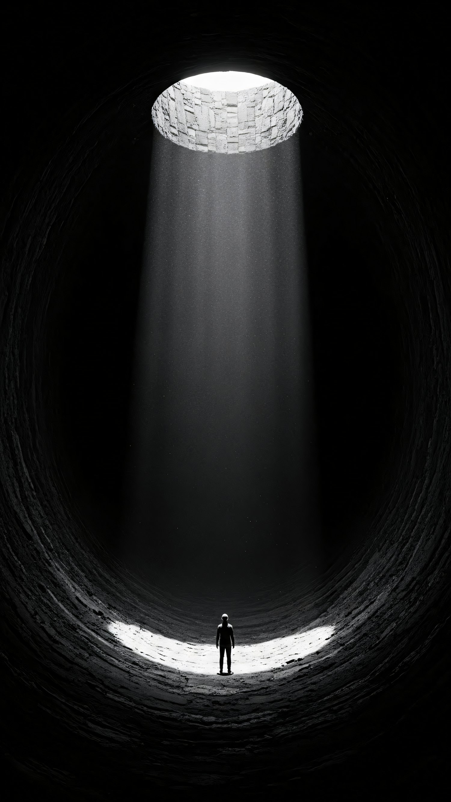 A lone figure stands in a deep, cylindrical stone structure, illuminated by a beam of light from above, creating a dramatic and introspective scene.