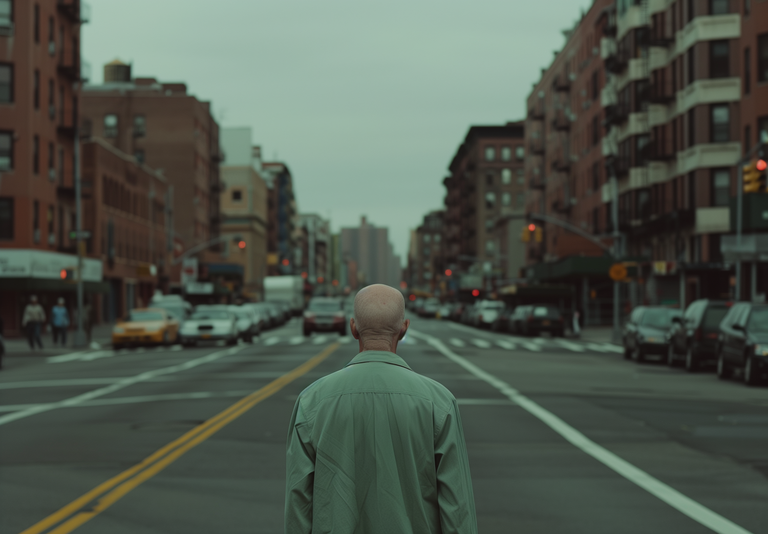 Bald man in green jacket stands on a city street, surrounded by tall buildings and cars, under an overcast sky.