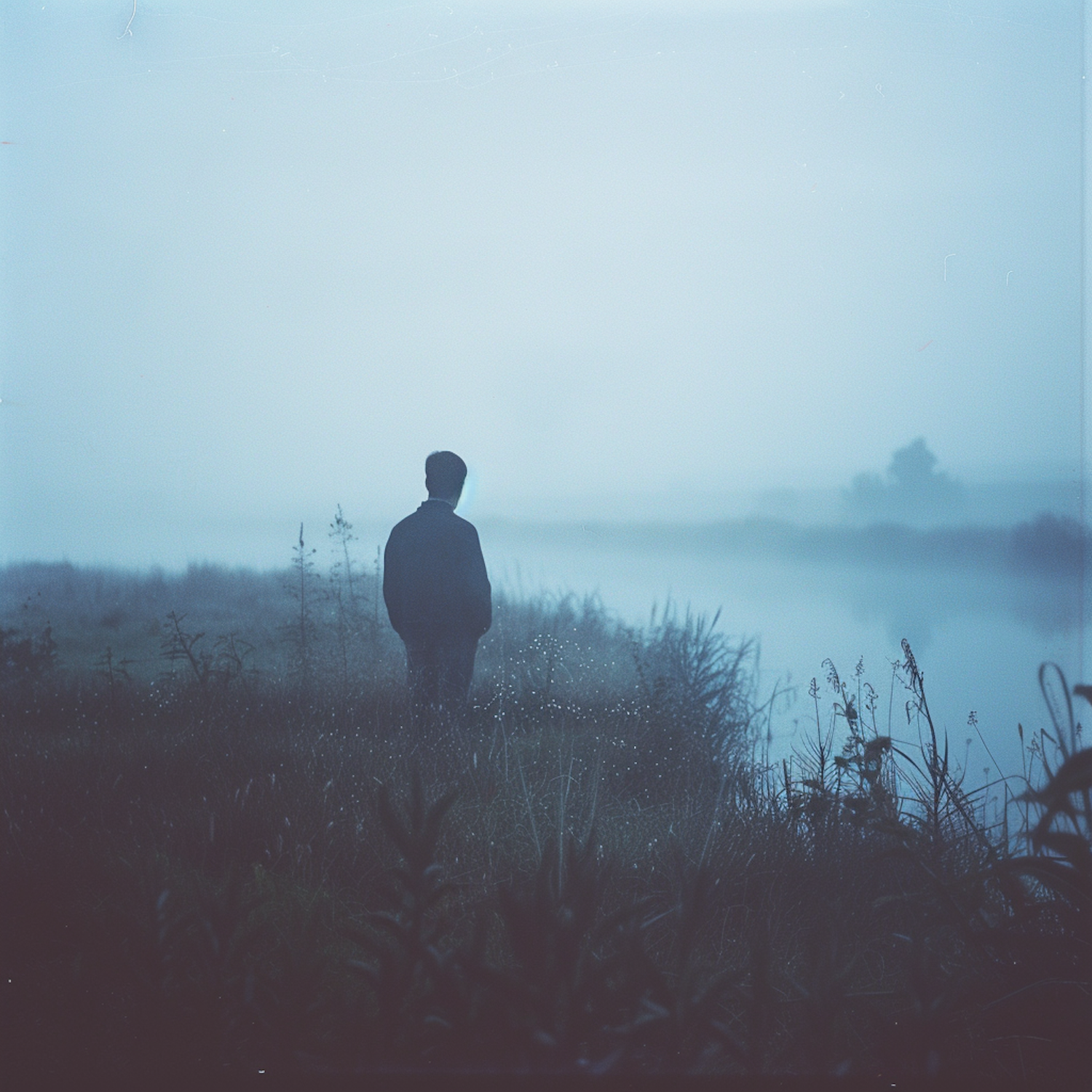 A solitary figure stands by a misty lake, surrounded by dew-kissed grasses in a serene, ethereal blue-toned landscape.