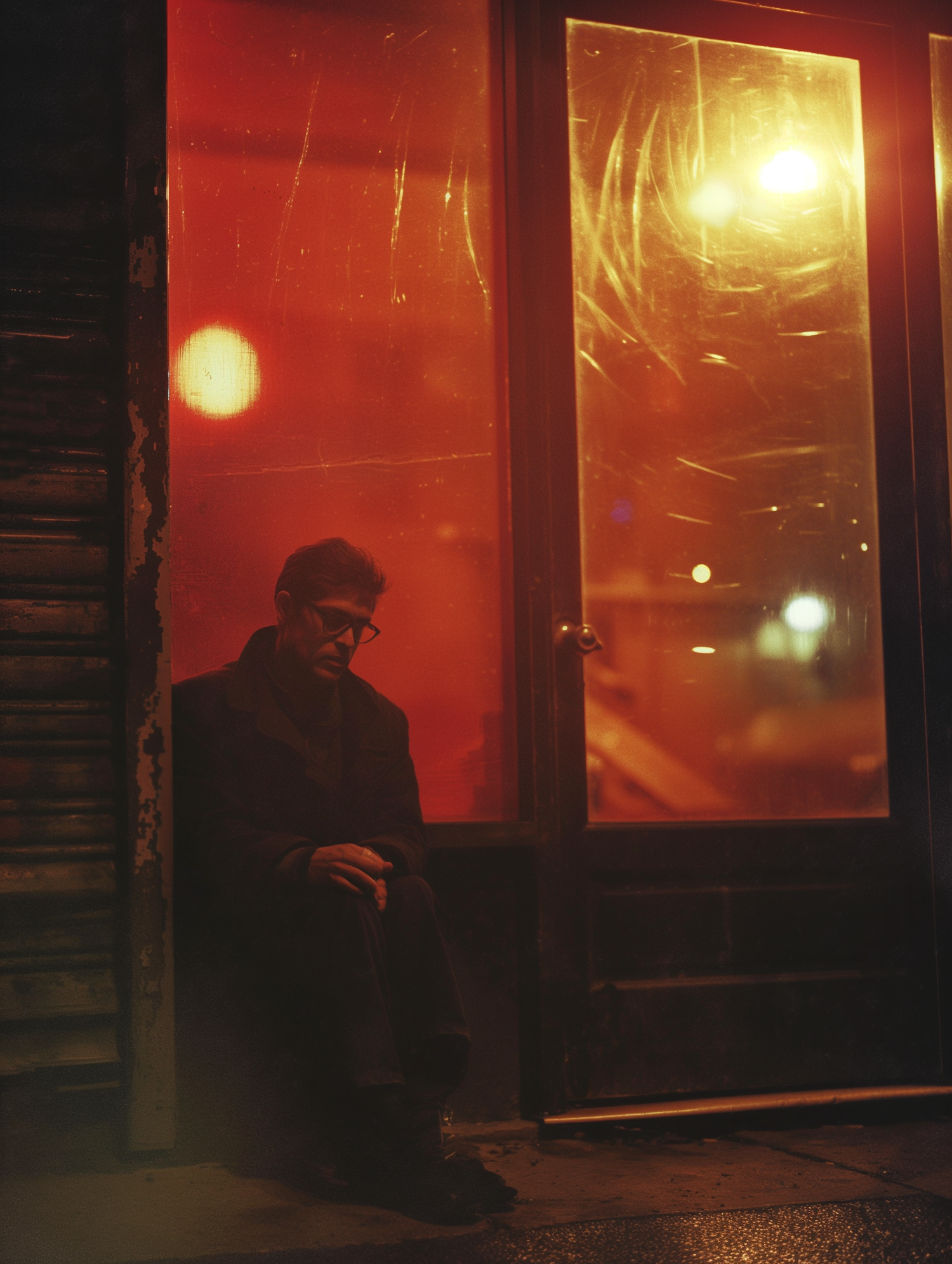 A solitary man sits in a dimly lit urban setting, bathed in a warm, reddish glow, creating a moody and introspective atmosphere.