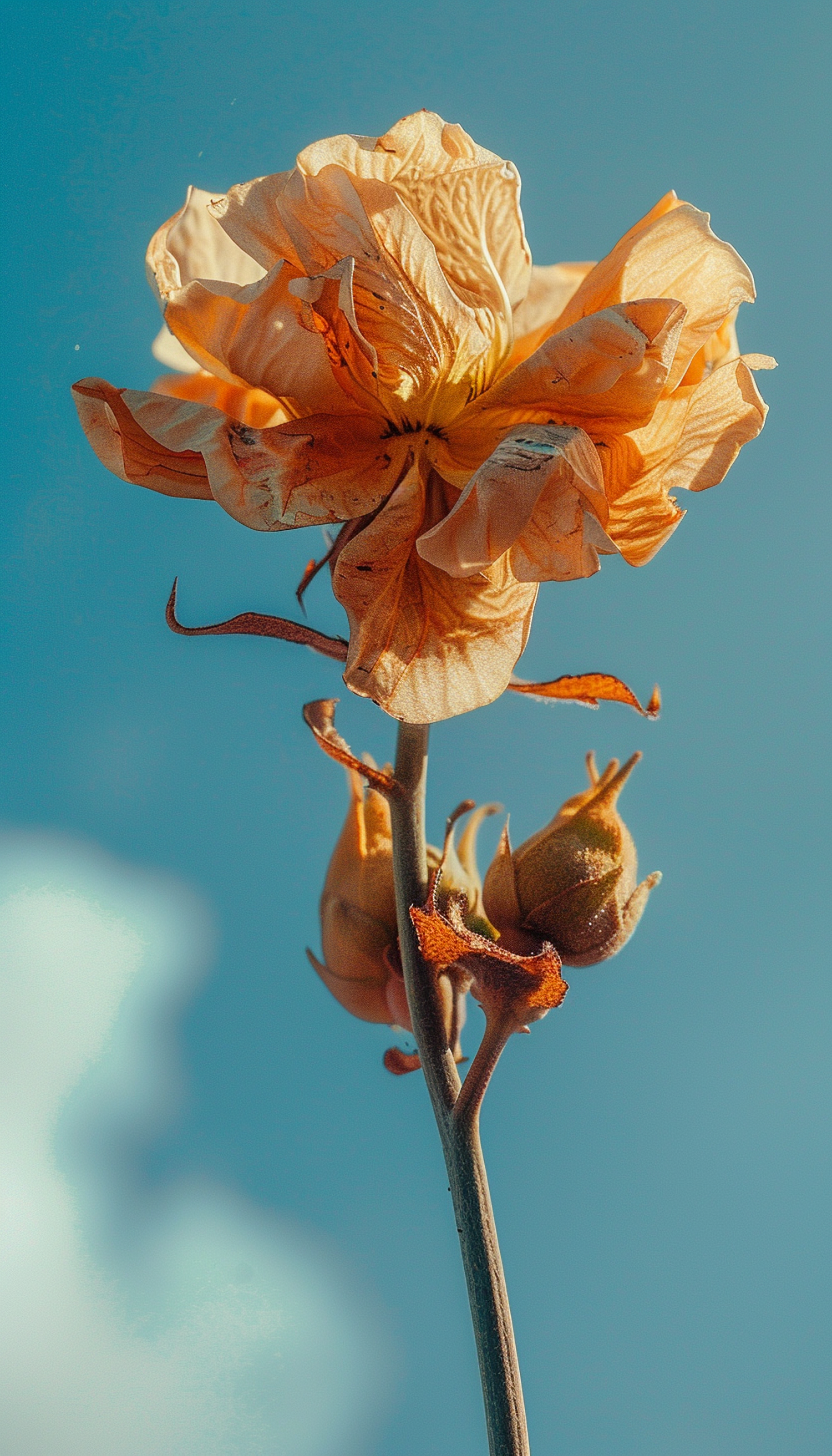 A dried orange flower with textured petals against a clear blue sky, highlighting its delicate beauty and intricate details.