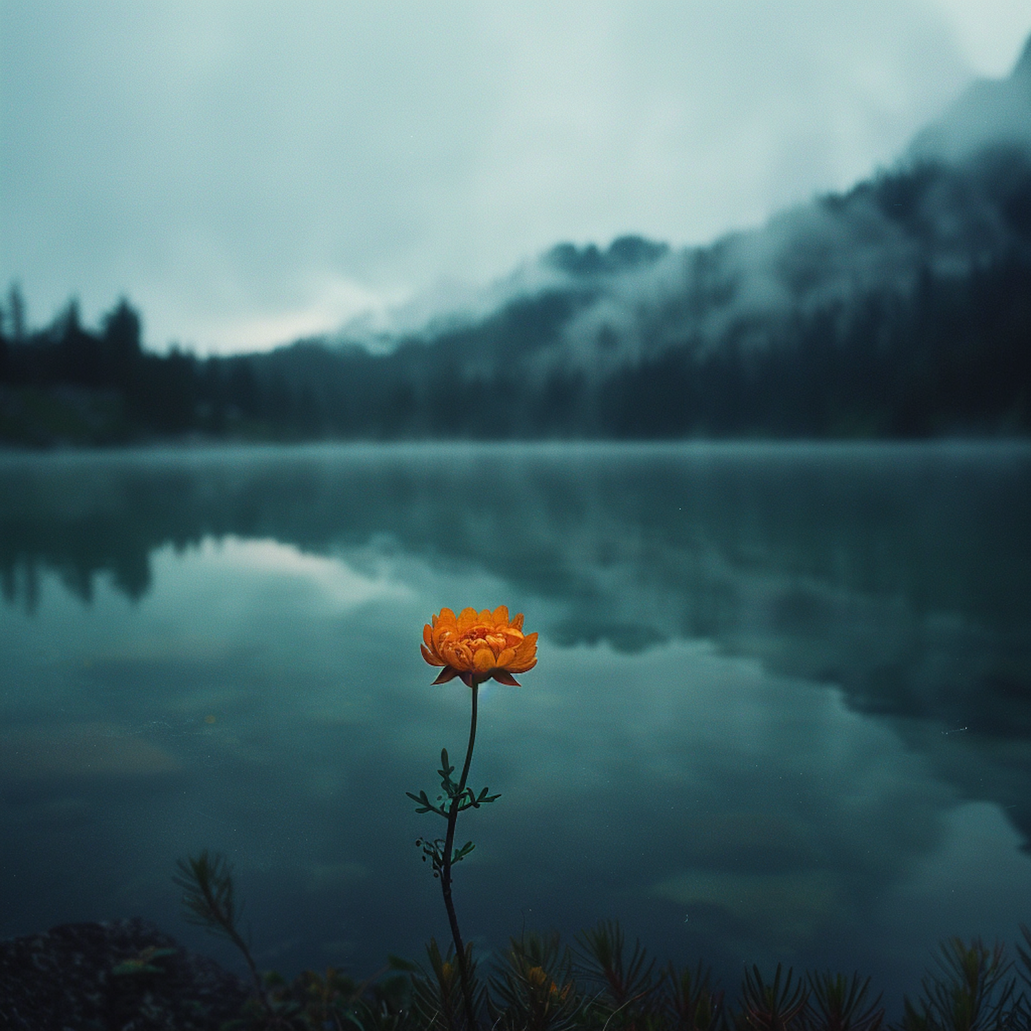 A vibrant orange flower stands out against a misty lake and mountain backdrop, creating a serene and ethereal scene.
