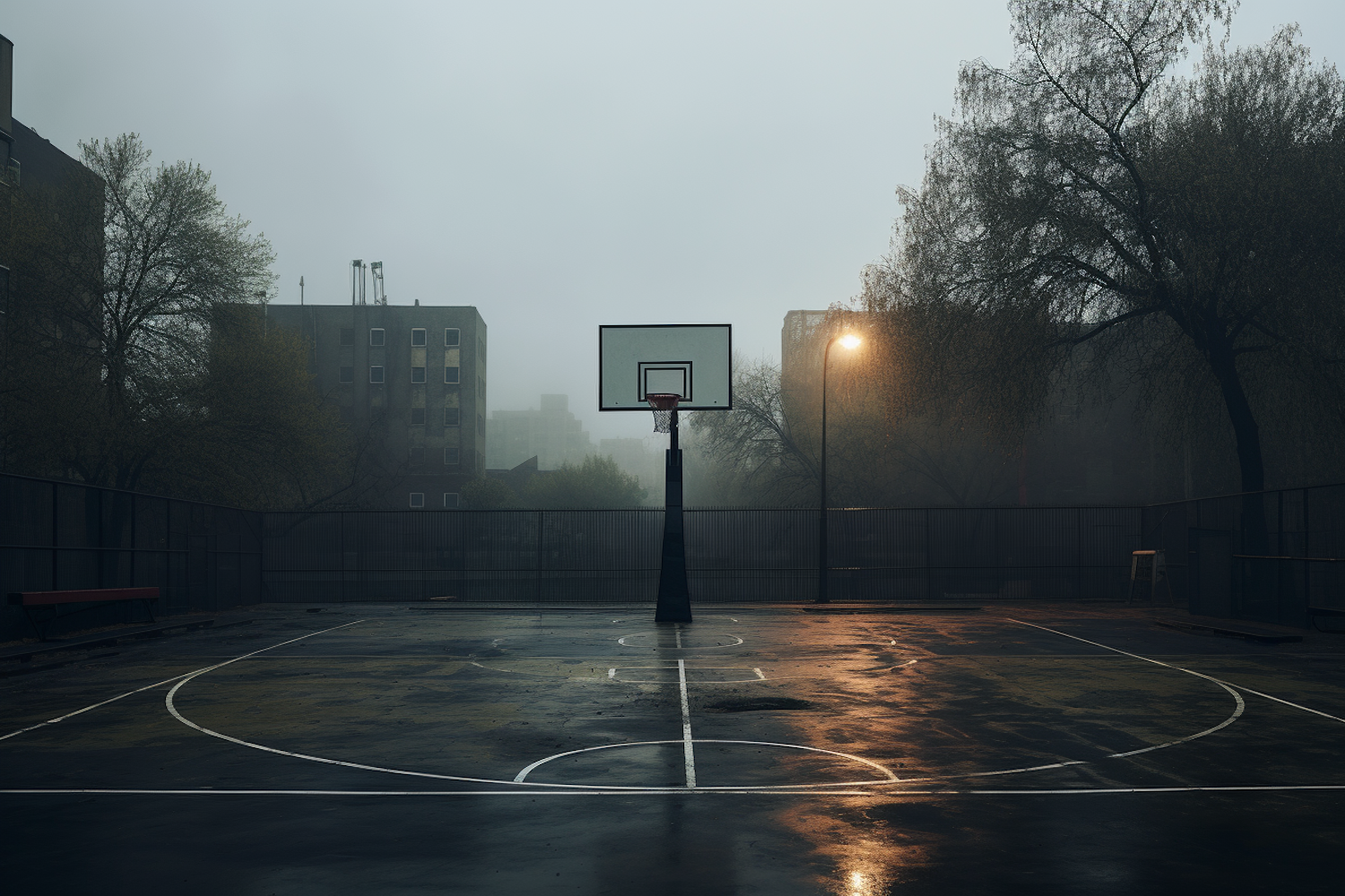 Moody, misty basketball court with wet surface, solitary hoop, and dim streetlamp. Urban buildings and trees in the background.