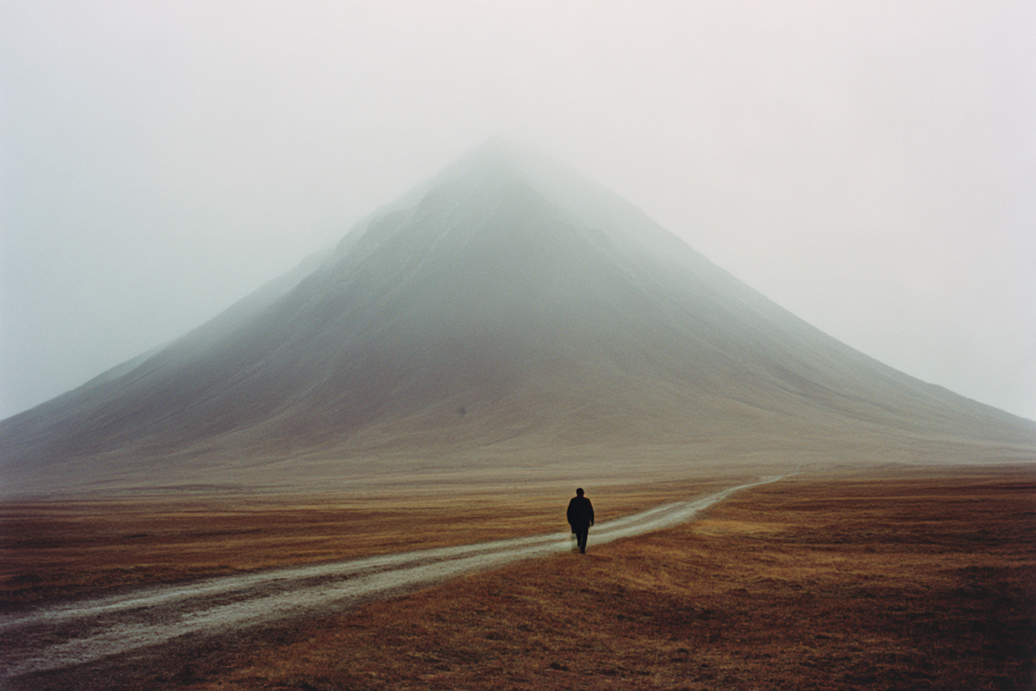 A lone figure walks towards a misty mountain, surrounded by a vast, golden plain, evoking solitude and the grandeur of nature.