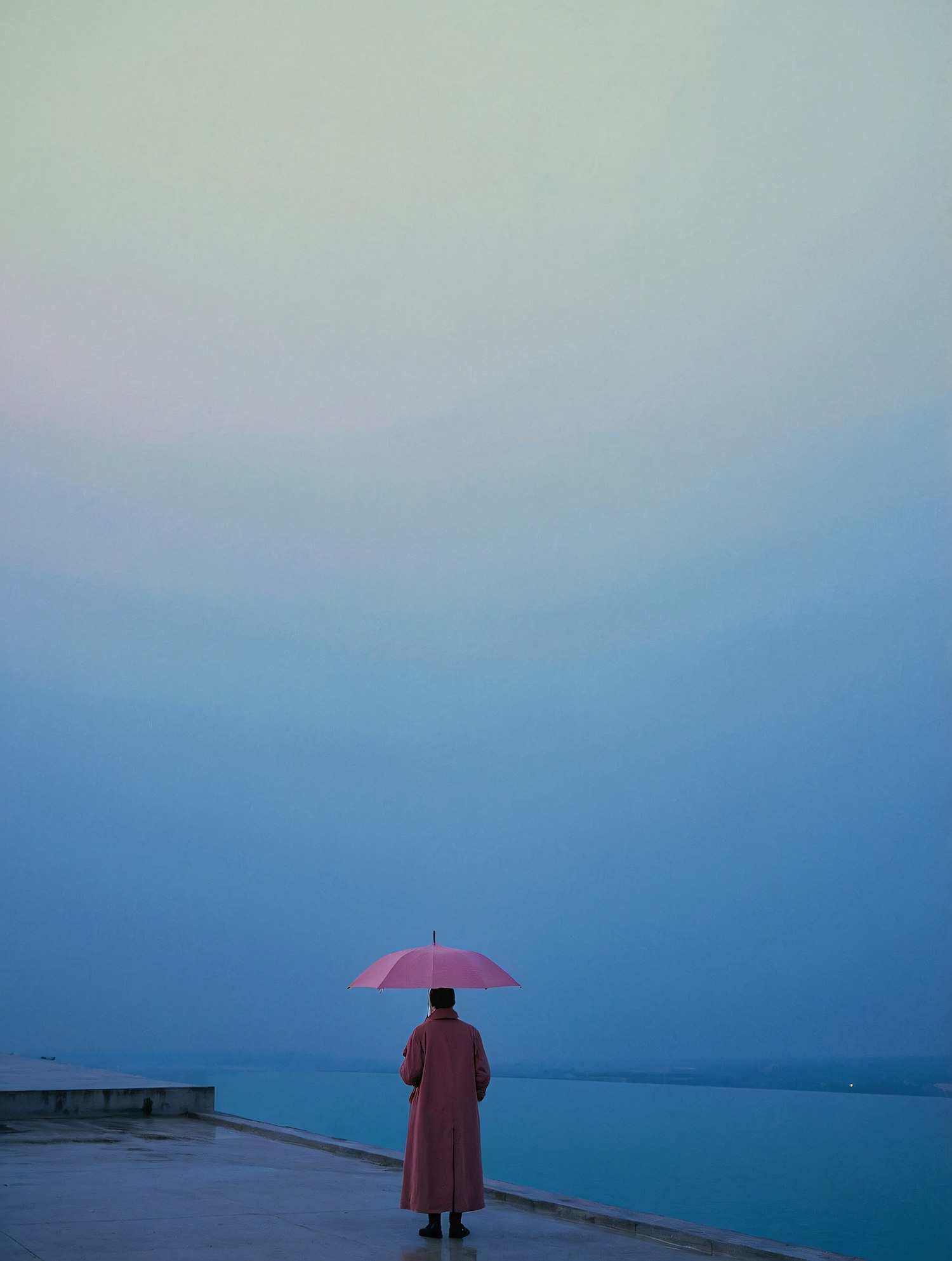 A person in a pink coat and umbrella stands alone by calm waters under a serene blue sky, creating a tranquil and minimalist scene.