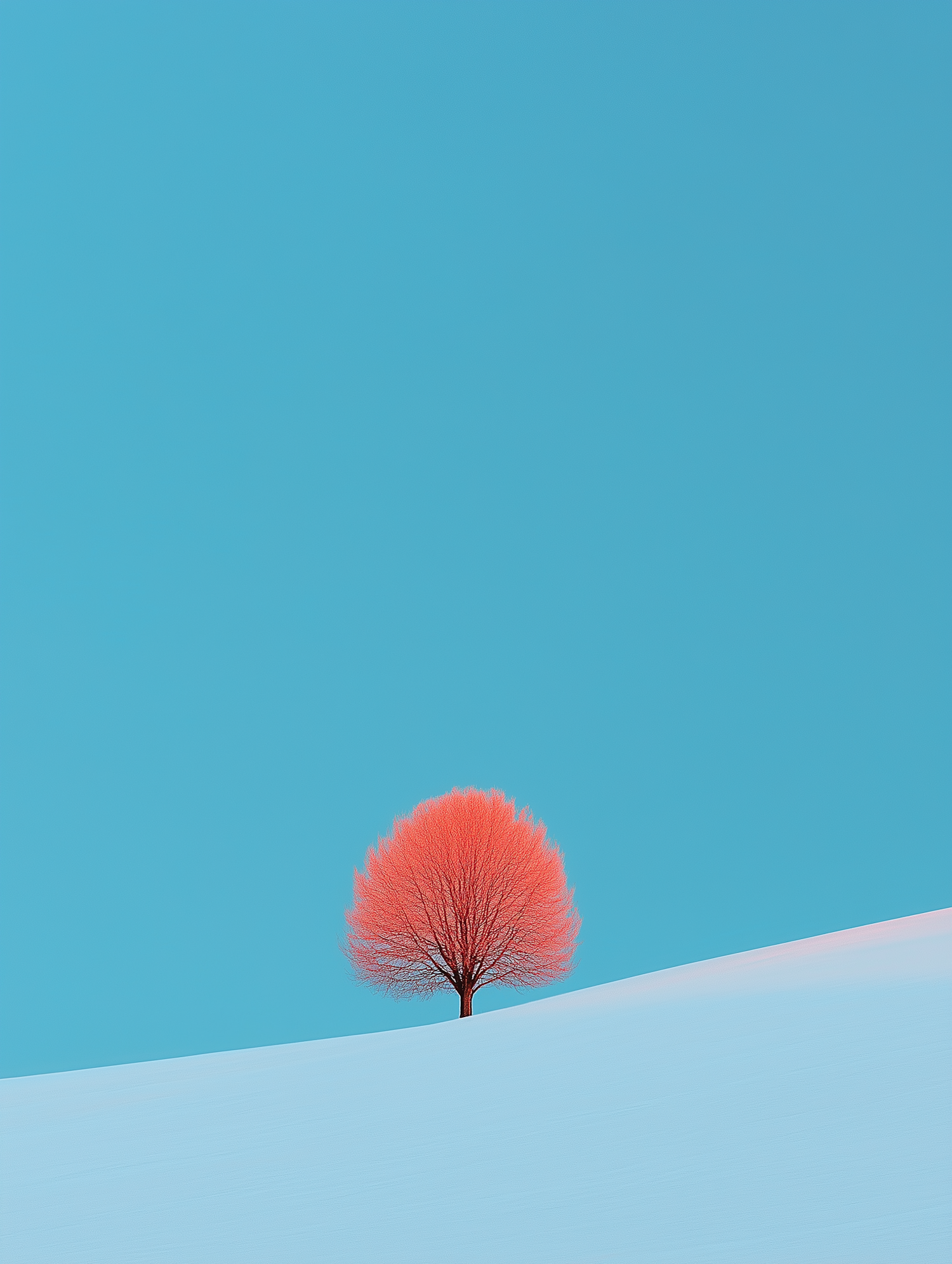 Vibrant pink tree on a snowy slope against a bright blue sky, creating a striking minimalist landscape.